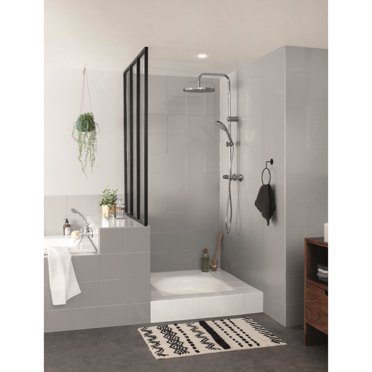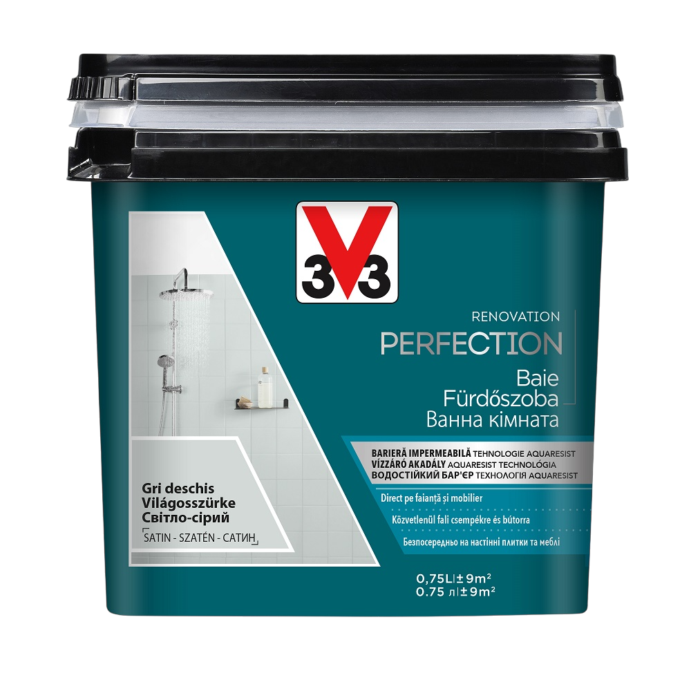 A V33 Renovation Perfection vizes bázisú, selyemfényű felújító festék kifejezetten fürdőszobai környezethez készült. A világosszürke árnyalat letisztult, modern megjelenést ad, miközben a festék közvetlenül a felületre felhordható, alapozás és a régi bevonatok eltávolítása nélkül. Az AQUARESIST technológia tartós, vízálló réteget képez a mindennapos vízterheléshez.