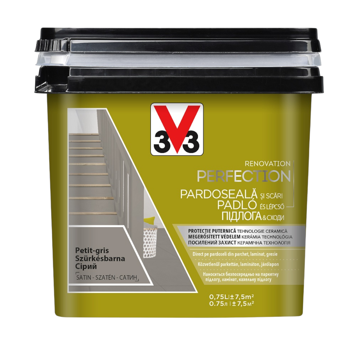 A V33 Renovation Perfection vizes bázisú, selyemfényű felújító festék beltéri padlók és lépcsők megújítására készült. A szürkésbarna árnyalat természetes, visszafogott megjelenést ad, miközben a festék alapozás nélkül, kiváló tapadással alkalmazható. A CERAMIC technológia rugalmas, mégis ellenálló bevonatot képez, amely jól viseli a mindennapi igénybevételt.