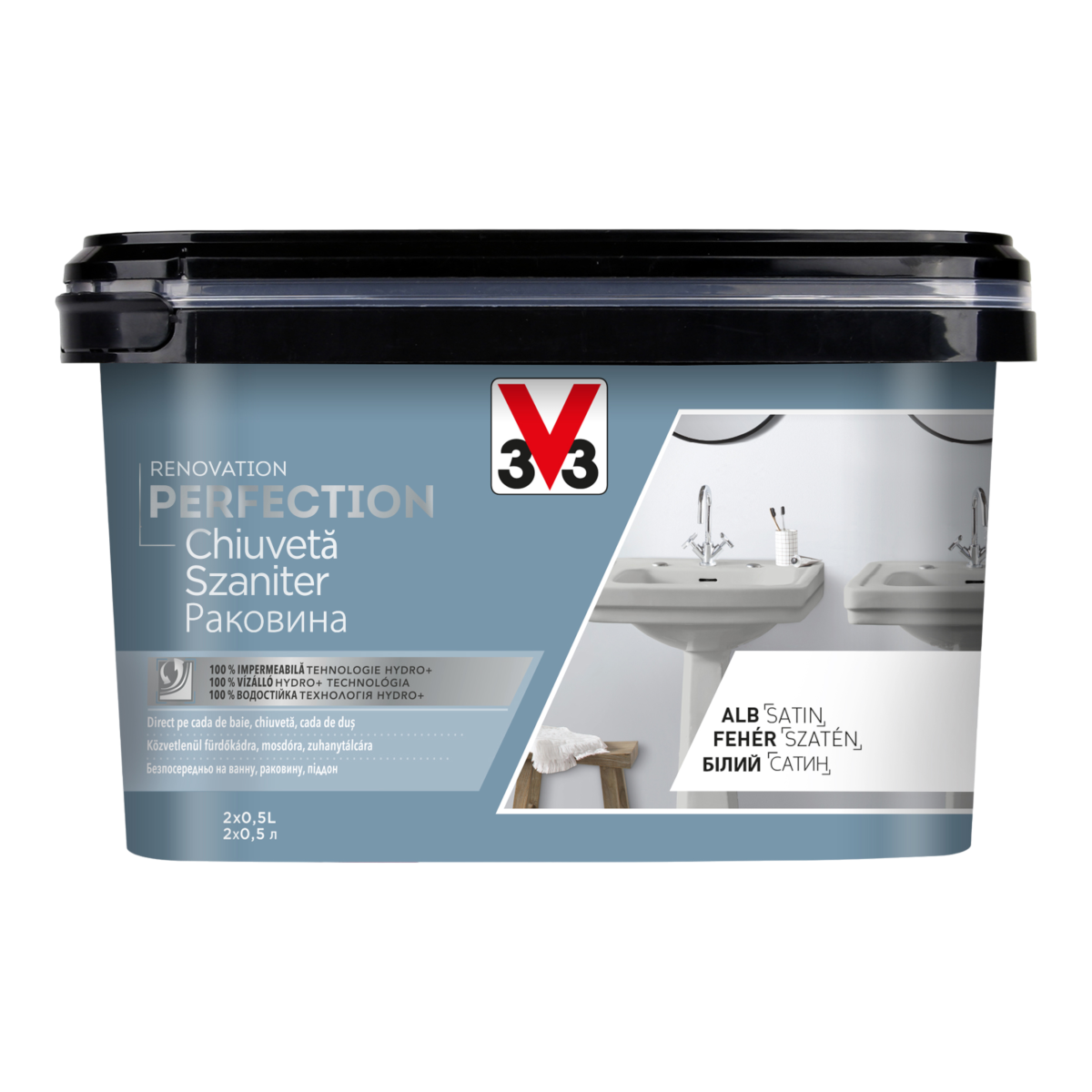 A V33 Renovation Perfection szaniter felújító festék kifejezetten fürdőkádak, mosdókagylók, zuhanytálcák és egyéb szaniter felületek megújítására készült. Vizes bázisú, 2 komponensű rendszer, amely festéket és védőlakkot is tartalmaz, így alapozás nélkül alkalmazható. A Hydro+ technológiának köszönhetően a bevonat teljesen vízálló, és jól tűri a folyamatos vízterhelést, valamint a hőmérséklet-ingadozásokat.