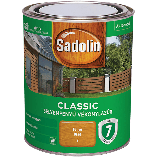 A Sadolin Classic HP kiváló minőségű, alkidgyanta bázisú, oldószeres, nyitott pórusú, beszívódó, dekoratív kültéri selyemmatt vékonylazúr nem mérettartó faszerkezetekre. - Akár 6 év védelem - 3in1: favédőszer, alapozó és lazúr egyben - Különösen szépen kiemeli a fa természetes erezetét, a kétféle rost színe között még kontrasztosabb hatást eredményez - UV- és időjárásálló - Vízlepergető - Véd a kékgomba ellen - Rendkívül kiadós - Száradási idő: 14-24 óra - Kiadósság: Gyalult fa: 12-14 m2/liter; Fűrészelt fa: 7-10 m2/liter - Felhordás módja: Ecset, Henger - Az alábbi fafajtákra javasolt: akác, bükk, ében, fenyő, teak, tölgy
