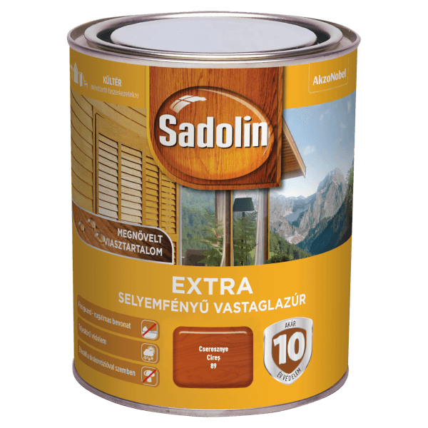 A Sadolin Extra kültéri, selyemfényű vastaglazúr óvja és díszíti a kültéri fafelületeket. Hosszantartó védelmet biztosít az időjárással, valamint a nap UV-sugárzásával szemben. A Sadolin Extra puhafa és keményfa felületek bevonására, natúr vagy már létező sértetlen, áttetsző bevonat festésére ajánlott. Vízlepergető hatású, és kiemeli a fa természetes szépségét. A megújult Sadolin Extra új összetétele révén még jobban beszívódik a fába, ezáltal még tartósabb védelmet nyújt. Száradási ideje 14-24 óra, kiadóssága gyalult fán 12-15 m2/liter; fűrészelt fán 6-8 m2/liter. Felhordás módja ecset vagy henger. Az alábbi fafajtákra javasolt: akác, bükk, ében, fenyő, teak, tölgy