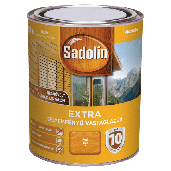 A Sadolin Extra kültéri, selyemfényű vastaglazúr óvja és díszíti a kültéri fafelületeket. Hosszantartó védelmet biztosít az időjárással, valamint a nap UV-sugárzásával szemben. A Sadolin Extra puhafa és keményfa felületek bevonására, natúr vagy már létező sértetlen, áttetsző bevonat festésére ajánlott. Vízlepergető hatású, és kiemeli a fa természetes szépségét. A megújult Sadolin Extra új összetétele révén még jobban beszívódik a fába, ezáltal még tartósabb védelmet nyújt. Száradási ideje 14-24 óra, kiadóssága gyalult fán 12-15 m2/liter; fűrészelt fán 6-8 m2/liter. Felhordás módja ecset vagy henger. Az alábbi fafajtákra javasolt: akác, bükk, ében, fenyő, teak, tölgy