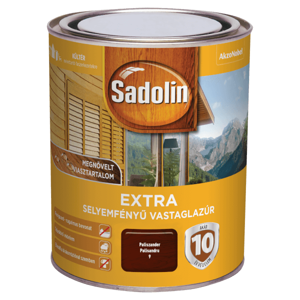 A Sadolin Extra kültéri, selyemfényű vastaglazúr óvja és díszíti a kültéri fafelületeket. Hosszantartó védelmet biztosít az időjárással, valamint a nap UV-sugárzásával szemben. A Sadolin Extra puhafa és keményfa felületek bevonására, natúr vagy már létező sértetlen, áttetsző bevonat festésére ajánlott. Vízlepergető hatású, és kiemeli a fa természetes szépségét. A megújult Sadolin Extra új összetétele révén még jobban beszívódik a fába, ezáltal még tartósabb védelmet nyújt. Száradási ideje 14-24 óra, kiadóssága gyalult fán 12-15 m2/liter; fűrészelt fán 6-8 m2/liter. Felhordás módja ecset vagy henger. Az alábbi fafajtákra javasolt: akác, bükk, ében, fenyő, teak, tölgy