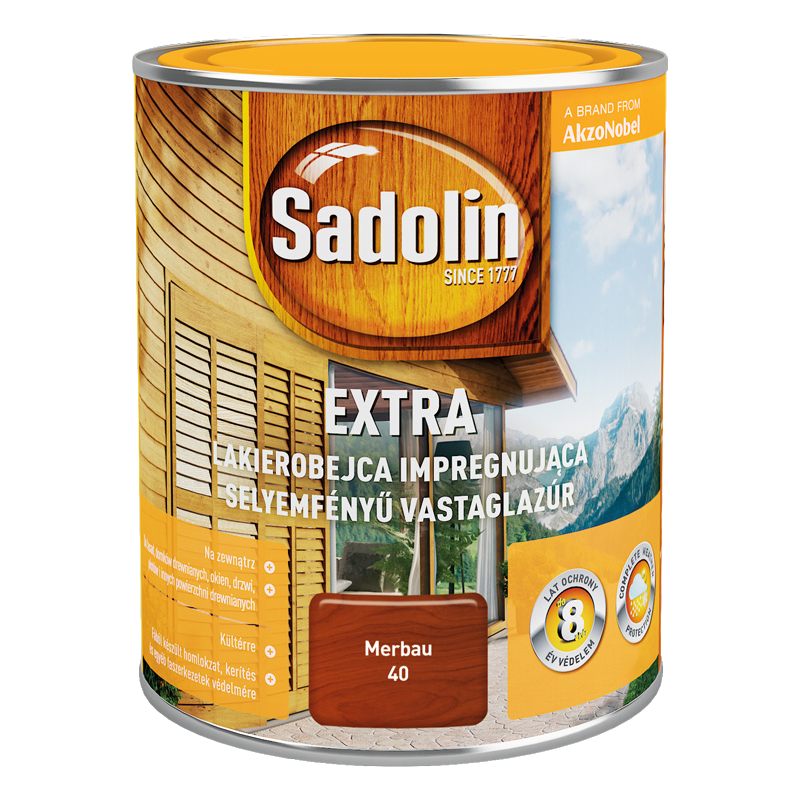 A Sadolin Extra kültéri, selyemfényű vastaglazúr óvja és díszíti a kültéri fafelületeket, hosszantartó védelmet biztosít az időjárással, valamint a nap UV-sugárzásával szemben. A Sadolin Extra puhafa és keményfa felületek bevonására, natúr vagy már létező sértetlen, áttetsző bevonat festésére ajánlott, vízlepergető hatású, és kiemeli a fa természetes szépségét. A megújult Sadolin Extra új összetétele révén még jobban beszívódik a fába, ezáltal még tartósabb védelmet nyújt. Száradási ideje 14-24 óra, kiadóssága gyalult fán 12-15 m2/liter, fűrészelt fán 6-8 m2/liter. Felhordás módja ecset vagy henger. Az alábbi fafajtákra javasolt: akác, bükk, ében, fenyő, teak, tölgy.
