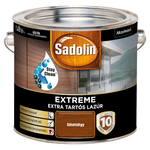 Sadolin Extreme vizes vastaglazúr 2,5L sötéttölgy színben. StayClean Technology: öntisztuló bevonat, vízlepergető, UV álló- véd a biokorrózió ellen, a termék kizárólag kültéri felhasználásra ajánlott. Nem alkalmazható: festett vagy lakkozott fa felületekre, az alábbi fafajtákra javasolt: Akác, Bükk, Fenyő, Teak, Tölgy. Száradási idő: 20 perc múlva érintésszáraz, 2 óra múlva esőálló bevonatot képez és átvonható, ne használjuk 8 °C alatt és 30 °C felett, kiadósság: 13 m2/liter, javasolt rétegszám: 2-3.