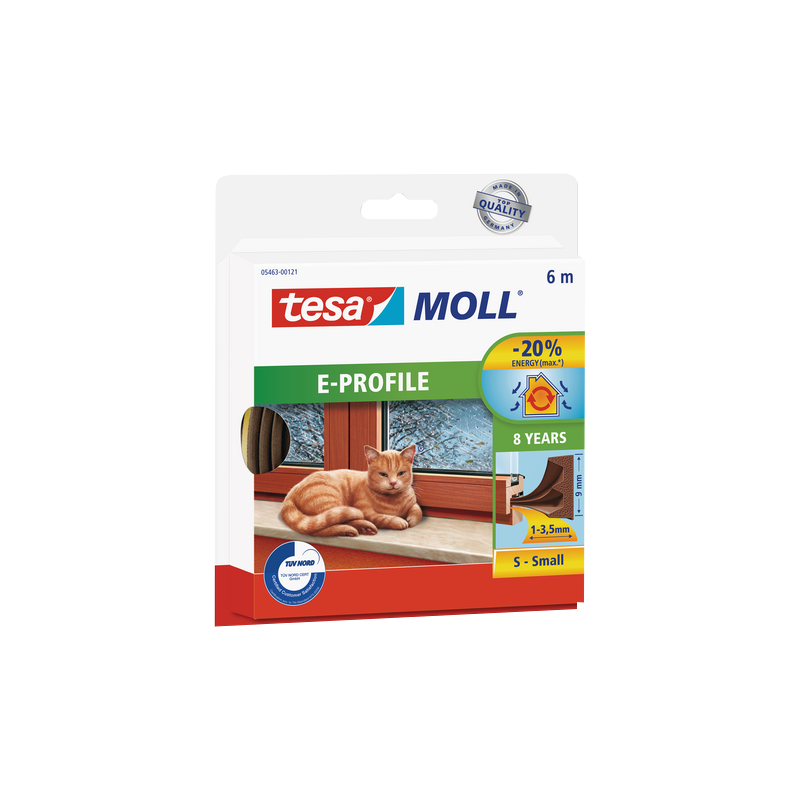 Idővel az ablakkeretek mozogni kezdenek, és már nem képesek megbízhatóan feltartóztatni a hideg levegőt, amikor erős széllökések érik őket. A tesamoll E-Profil egy öntapadós gumi tömítőszalag, amely kifejezetten arra készült, hogy lezárja az öregebb ablakokra jellemző rejtett réseket és feltartóztassa a hideg levegőt. Hatékony szélgátlóként szolgál, amelyet egyszerűen rá kell ragasztani végig az ablakkeretre, és hosszan tartó tömítő hatást biztosít ablakainak, mellyel energiaköltségei akár 20 %-át megtakaríthatja. Ollóval egyszerűen a kívánt méretre vágható és segédszerszám nélkül felragasztható. A hosszú élettartamú gumi UV-, időjárás- és ózonálló, így sokáig óvhatja otthona melegét. 9 mm x 6 m-es kiszerelésben.