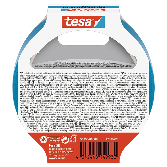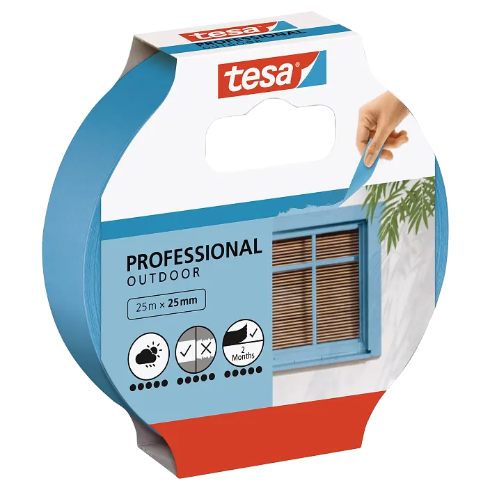 A tesa Professional kültéri festőszalag egy környezetbarát maszkolószalag kifejezetten kültéri festéshez. Oldószermentes ragasztóbevonattal van ellátva. Ez az extra vékony, kék színű festőszalag újrahasznosított papírból készült. Vékony alapanyagának és kiváló minőségének köszönhetően precíz festékszélek festhetők a segítségével. Megbízható tapadást biztosít, és nyom nélkül eltávolítható. Időjárásálló ,és ellenáll az UV-sugárzásnak is, így tökéletesen alkalmas bármilyen kültéri felújítási munkához.