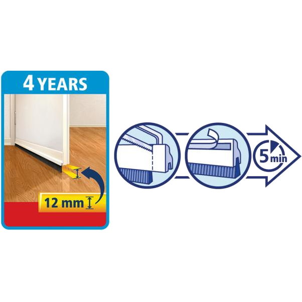 Különösen a hideg évszakban fontos, hogy bent tartsuk az értékes meleget és megakadályozzuk a huzatot. Az öntapadós tesamoll standard ajtóseprű segítségével hatékonyan tömítheti az ajtószárny és a padló közötti rést fúrás és csavarozás nélkül. Ez a műanyag ajtószigetelő különböző színekben kapható. Pontosan az ajtószárny méretére szabható. Kopásálló nylon seprűvel felszerelve hatékonyan szigeteli az ajtó és a padló között réseket 12mm-ig.