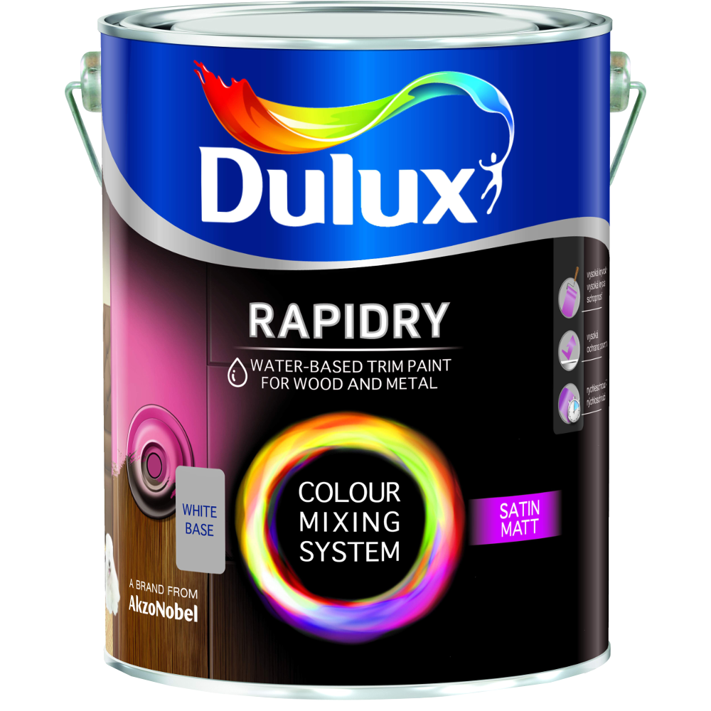 DULUX RAPIDRY SATIN SF VIZESBÁZISÚ. Prémium minőségű vizes bázisú selyemfényű zománcfesték fa-, vas- és egyéb fémfelületre. Kellemetlen szagtól mentes, így beltérben és kültéren is egyaránt használható. 90 °C-ig hosszútávon ellenáll a hőnek, így jól használható radiátorok vagy egyéb fűtőtestek esetén. Könnyen felvihető, fedőképessége kiváló. Kiadósság: 14 m2/liter . Száradási idő: 6 óra .2 rétegben ajánlott felhordani .Színkeverés szolgáltatásunkhoz