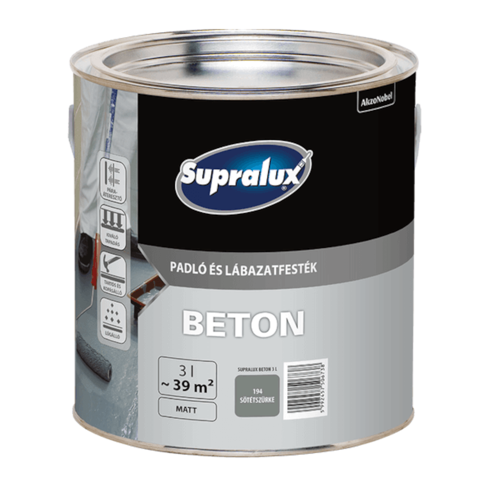 A Supralux Beton padló- és lábazatfesték 194 sötétszürke színben megbízható, kül- és beltéri alkalmazásra alkalmas bevonatot ad. Oldószeres akril bázisú összetétele kemény, jól tapadó felületet hoz létre, és alkalmas vasbeton korrózió elleni védelmére is. Beton felületeken túl használható betonyp, tégla, vakolat, fa, pala (sík- és hullámpala), különféle kőburkolatok, valamint kerámia burkolólapok festésére is. Aszfaltra azonban nem ajánlott.