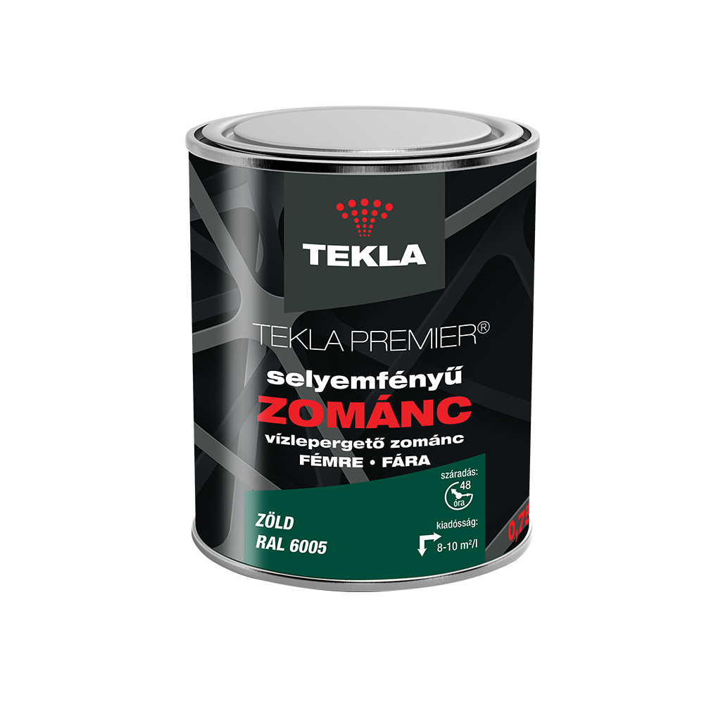 A Tekla Premier selyemfényű zománcfesték vízlepergető viaszt tartalmaz, amely extra védelmet biztosít a festett felületek számára. Könnyen felhordható és jól terül, így egyenletes, esztétikus bevonat alakítható ki vele. A RAL 6005 zöld árnyalat karakteres, mégis elegáns megjelenést kölcsönöz különböző fa- és fémfelületeken.