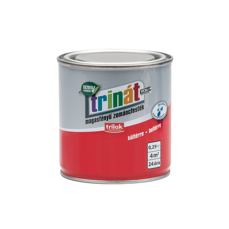 Trinát magasfényű alkidgyanta kötőanyagú zománcfesték. Vízlepergető adalékainak köszönhetően képes a bevont felületeket megvédeni az időjárás káros hatásaitól és késleltetni a korhadást, korróziót. Alapozott kül- és beltéri fafelületek (bútorok, nyílászárók stb.) és beltéri falfelületek (lépcsőházak, iskolák), továbbá kül- és beltéri fémszerkezetek (kerítés, csövek stb.) átvonó festésére használható. Használat előtt alaposan fel kell keverni! Nem szükséges hígítani, amennyiben mégis szükséges, ecsettel történő alkalmazáshoz max. 2% Trinát szintetikus hígítóval ajánlott. A bevonandó felület legyen száraz, pormentes, hordképes, megfelelően előkészített. Faanyagok esetén az anyag max. 5% nedvességtartalmú lehet. A festék felhordása ecsettel, lakkhengerrel vagy szóróberendezéssel javasolt 2 rétegben. 12 óra elteltével átfesthető, a teljes száradási idő 48 óra. A kép csak tájékoztató jellegű! A termék színei különbözhetnek a monitoron látottaktól. Színhelyes mintákért látogasson el áruházainkba, ahol személyesen válogathat változatos kínálatunkból.