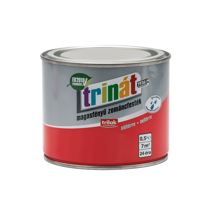 Trinát magasfényű alkidgyanta kötőanyagú zománcfesték. Vízlepergető adalékainak köszönhetően képes a bevont felületeket megvédeni az időjárás káros hatásaitól és késleltetni a korhadást, korróziót. Alapozott kül- és beltéri fafelületek (bútorok, nyílászárók stb.) és beltéri falfelületek (lépcsőházak, iskolák), továbbá kül- és beltéri fémszerkezetek (kerítés, csövek stb.) átvonó festésére használható. Használat előtt alaposan fel kell keverni! Nem szükséges hígítani, amennyiben mégis szükséges, ecsettel történő alkalmazáshoz max. 2% Trinát szintetikus hígítóval ajánlott. A bevonandó felület legyen száraz, pormentes, hordképes, megfelelően előkészített. Faanyagok esetén az anyag max. 5% nedvességtartalmú lehet. A festék felhordása ecsettel, lakkhengerrel vagy szóróberendezéssel javasolt 2 rétegben. 12 óra elteltével átfesthető, a teljes száradási idő 48 óra. A kép csak tájékoztató jellegű! A termék színei különbözhetnek a monitoron látottaktól. Színhelyes mintákért látogasson el áruházainkba, ahol személyesen válogathat változatos kínálatunkból.