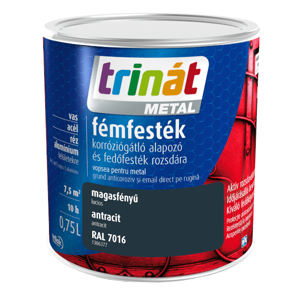 Magasfényű, jól terülő, uretán alkidgyanta kötőanyagú, oldószeres Trinát Metal fémfesték. Kültéri és beltéri acél, réz, alumínium és vas felületek bevonására alkalmazható alapozó és fedőfesték. Rozsda elleni aktív felületet biztosít. Aromás szénhidrogéneket nem tartalmaz, egyenletes, esztétikus felületet képez. A festendő felület legyen száraz, por- és zsírmentes, hordképes, megfelelően előkészített. Zsírtalanításhoz zsíroldószeres víz ajánlott, mivel a tiszta oldószerbe mártott rongy zsíros nyomot hagy. A festék felhordása ecsettel, hengerrel vagy szóróberendezéssel javasolt 2-3 rétegben. Az első réteg után legfeljebb 2 óra teljen el a következő rétegek felhordásáig, akkor is, ha az első réteg még nem száradt meg. Ha ez nem lehetséges, legalább 48 óra várakozást követően szabad felfesteni. A termék felhasználásra készen kerül csomagolásra, így hígítani nem szükséges. Anyagszükséglete rétegenként: 0,10 l/m2. 23 °C-on kb. 24 óra múlva szárad meg. A festés teljes átszáradása 48 óra múlva következik be.