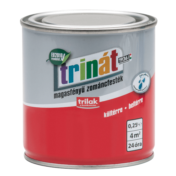 Trinát magasfényű alkidgyanta kötőanyagú zománcfesték. Vízlepergető adalékainak köszönhetően képes a bevonat felületeket megvédeni az időjárás káros hatásaitól és késleltetni a korhadást, korróziót. Alapozott kül- és beltéri fafelületek (bútorok, nyílászárók stb.) és beltéri falfelületek (lépcsőházak, iskolák), továbbá kül- és beltéri fémszerkezetek (kerítés, csövek stb.) átvonó festésére használható. Használat előtt alaposan fel kell keverni! Nem szükséges hígítani. Amennyiben mégis szükséges, ecsettel történő alkalmazáshoz max 2% szintetikus hígítóval ajánlott. A bevonandó felület legyen száraz, pormentes, hordképes, megfelelően előkészített. Faanyagok esetén az anyag max. 5% nedvességtartalmú lehet. A festék felhordása ecsettel, hengerrel vagy szóróberendezéssel javasolt 2 rétegben. 12 óra elteltével átfesthető, a teljes száradási idő 48 óra.