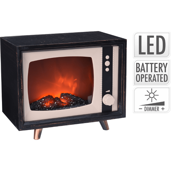 TV alakú LED-es látványkandalló fekete színben, anyaga műanyag és üveg, fényerőssége szabályozható, 3xC típusú 1,5V-os elemmel működik, mely nem tartozéka a terméknek.