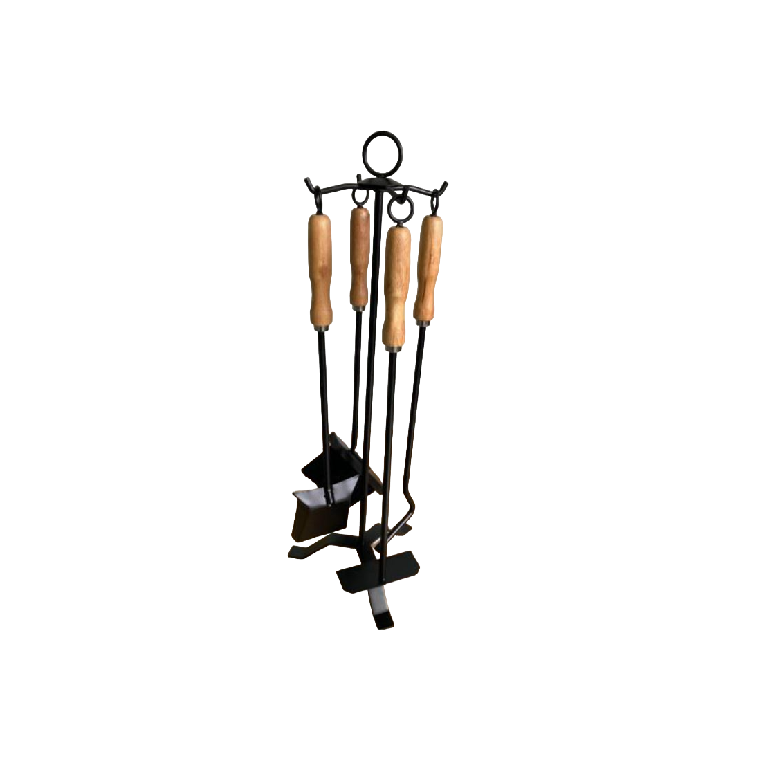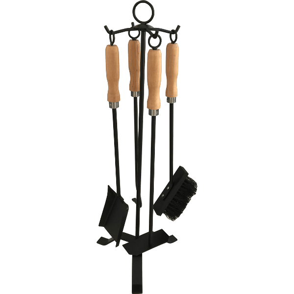 4 részes kandalló készlet – praktikus tisztítószett fa nyéllel és állvánnyal
