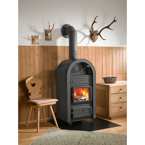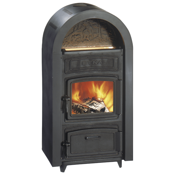"Etna" íves, öntvény kandalló, duplafalú burkolattal, samott tűztérrel, felső/hátsó füstkivezetéssel. Mérete: 117,6x60x48,1 cm. Folyamatos üzemre alkalmas. - Fűthető légtér: max 200 m3 - Tömege: 160 kg - Füstcsőcsatlakozás átmérője: 150 mm - Tüzelőanyag: tűzifa, barnaszén - Hatásfok: 76%