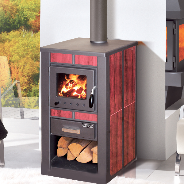 Alpina szabadon álló lemezkandalló, oldalán csempével. Hatásfok max. 75%. Kandalló mérete 86x50x48 cm. Tűztér mérete: 41x32x40 cm.