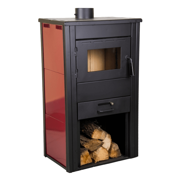 Színes (bordó) oldalú lemez kandalló. Teljesítmény 8kW Füstcső átmérő 120mm