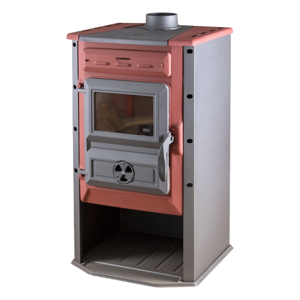Nagy ablakos szabadon álló lemez kandalló, öntöttvas ajtóval és tetővel, fatárolóval. 10kw-os teljesítményével elegendő egy kb 40-50 nm-es helyiség befűtéséhez.
