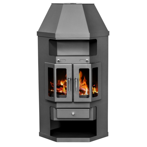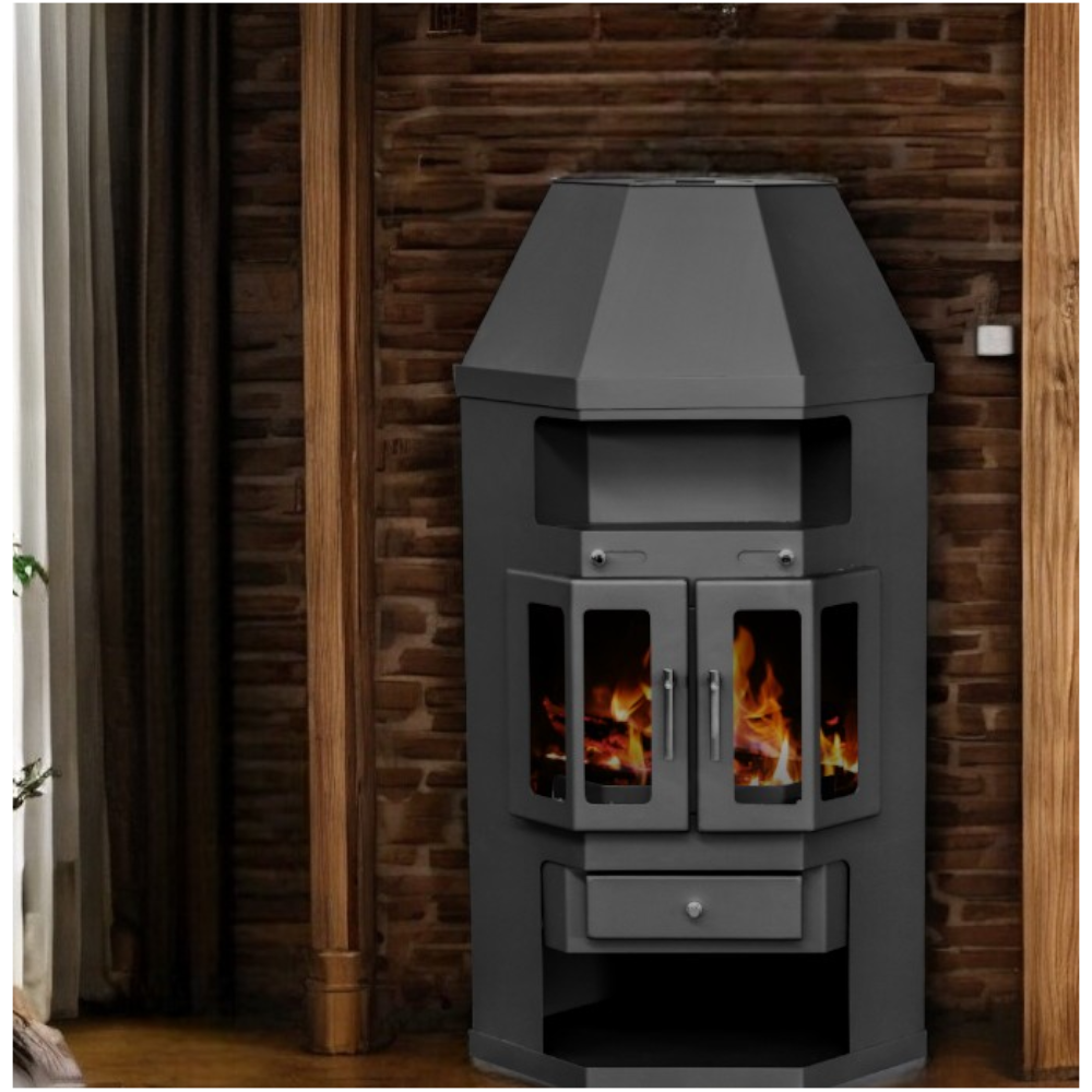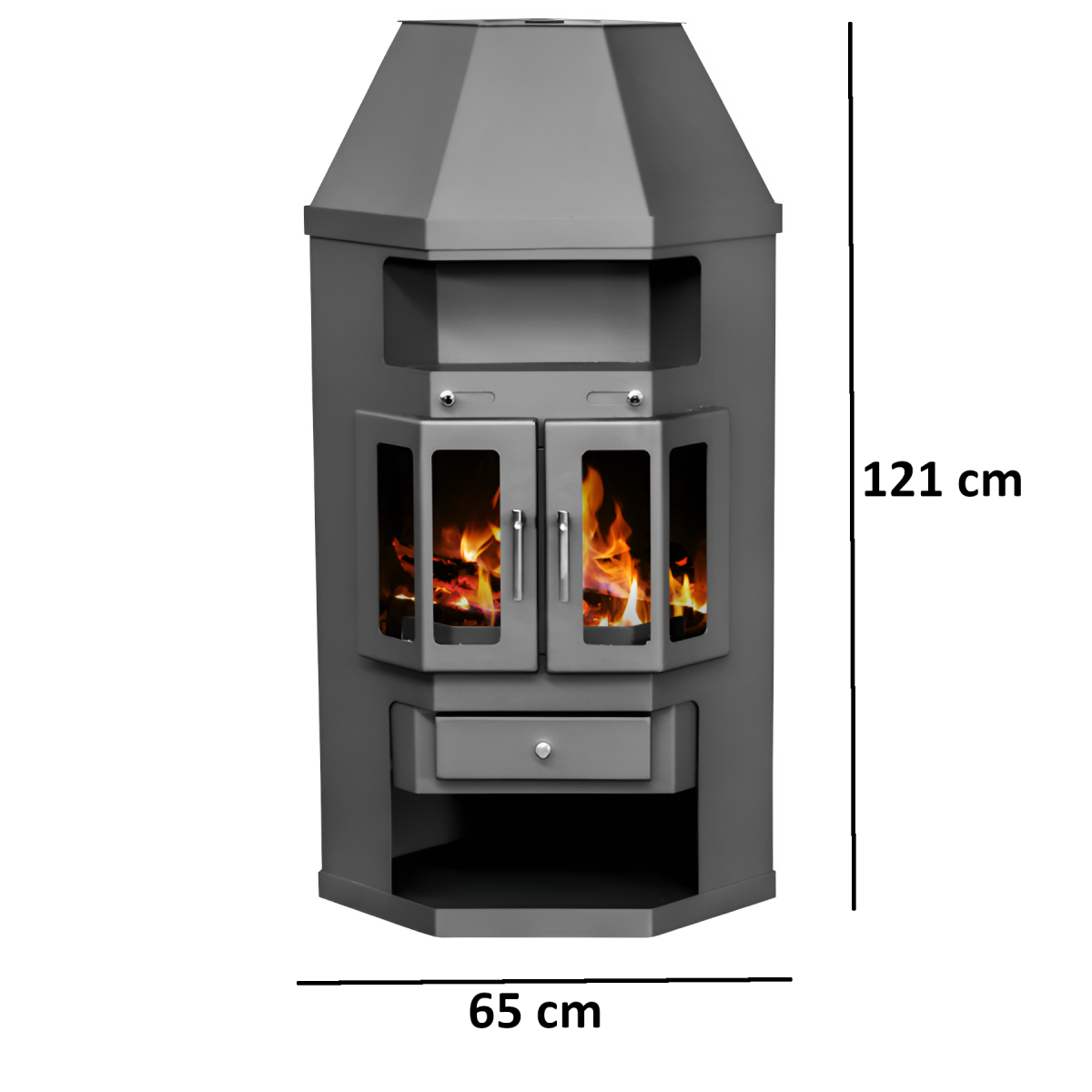 Teljesítmény: 9 kW. Szín: fekete. Súly 75.kg. Befűthető légtér max 180 m3. Füstcsőcsonk mérete 150 mm, felső. Hatásfok maximum 76,87%. Rejtett zsanérokkal rendelkezik. Stílusos kiegészítője lehet bárki otthonának.