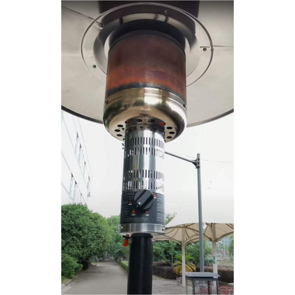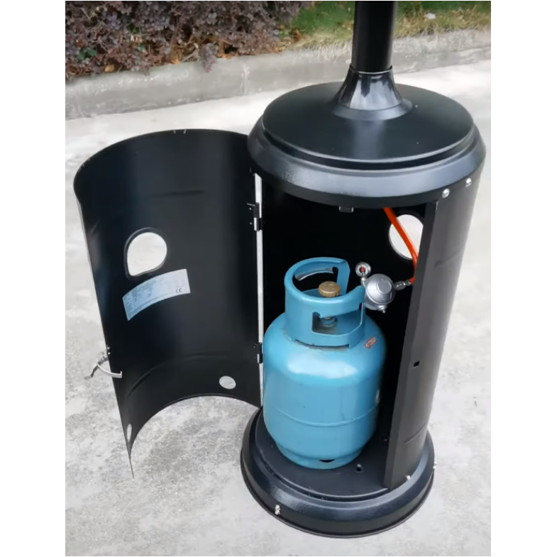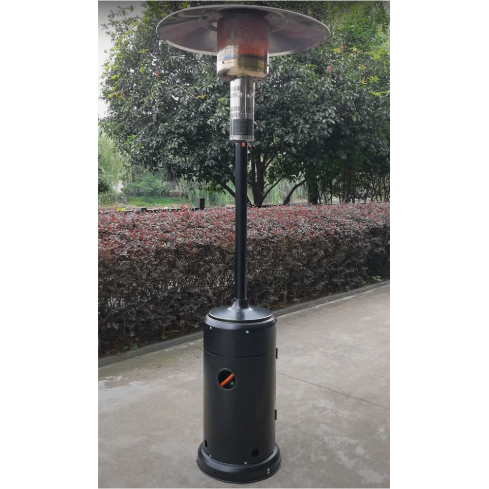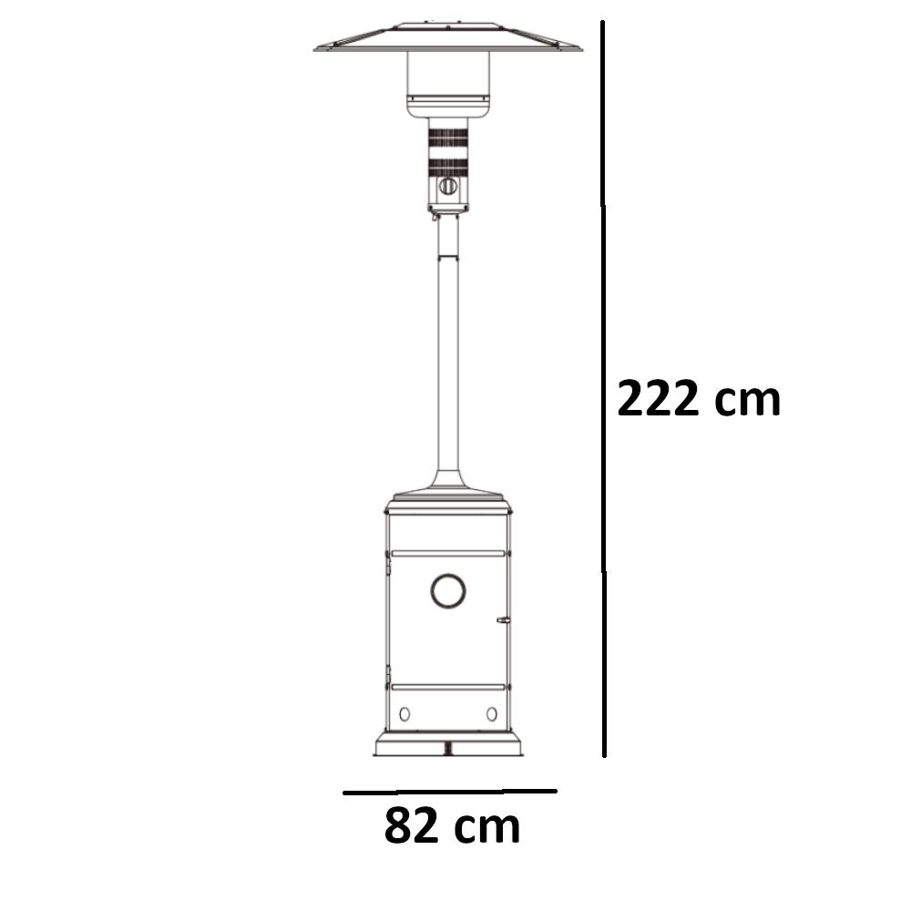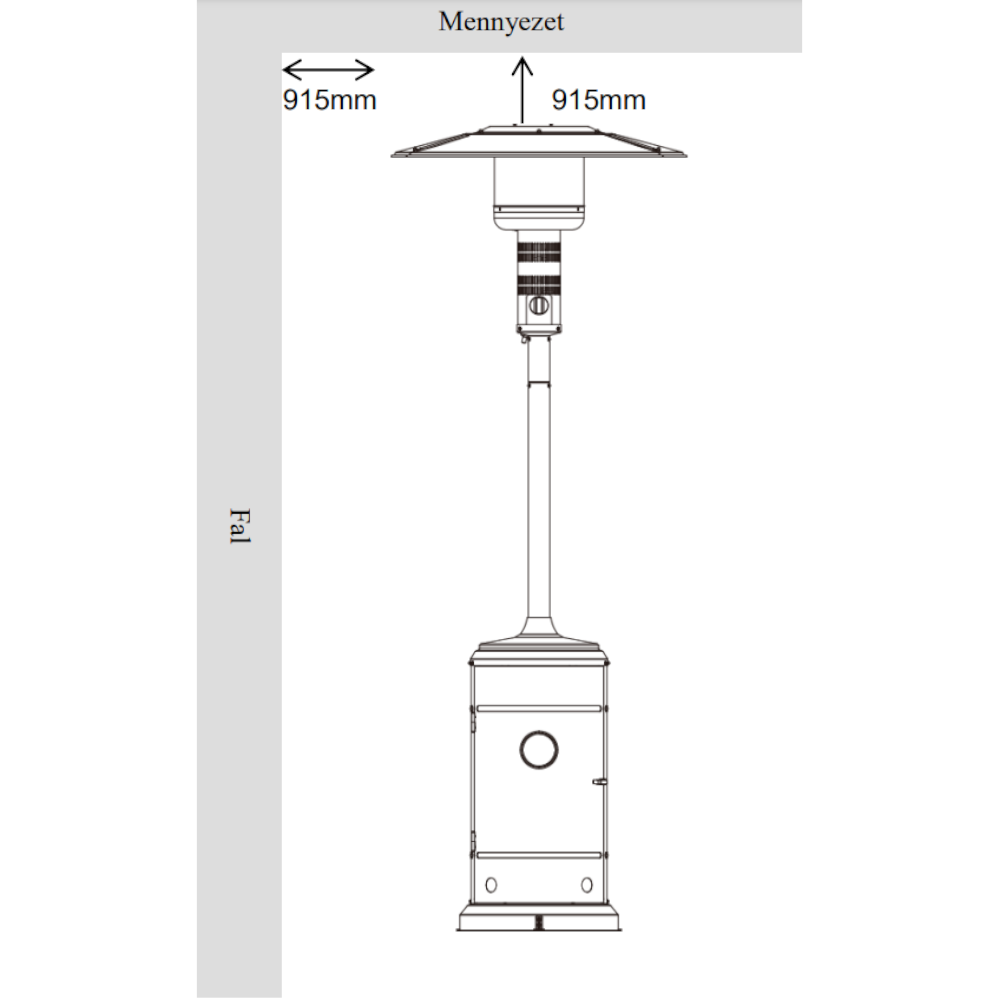Piezo elektromos gyújtással és biztonsági termoelemmel rendelkező, rozsdamentes reflektorral, gáztömlővel, nyomáscsökkentővel felszerelt fűtőtest. Gázpalack ajtó és kerekek találhatóak rajta. PB (propán-bután) gázzal működik. Hagyományos formát képvisel, anyaga porszórt acél, időjárásálló kivitel. Kiváló megoldás teraszok, kerthelyiségek vagy kisebb szabadtéri területek, rendezvényhelyszínek fűtésére. Hőterhelés: 11-13,5 KW. Gázfogyasztás: 731-928 g/h. Melegítő kapacitása: 50 m2. TÜV/CE bevizsgált termék. Csak szabadtéri használatra javasolt!