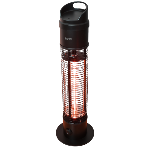 Infra teraszhősugárzó "HIM 1200/1/2". Teljesítmény 1200 W. Mérete 20x20x66 cm. Asztal alá tehető hordozható, kültéri használatra alkalmas 3,3 kg.