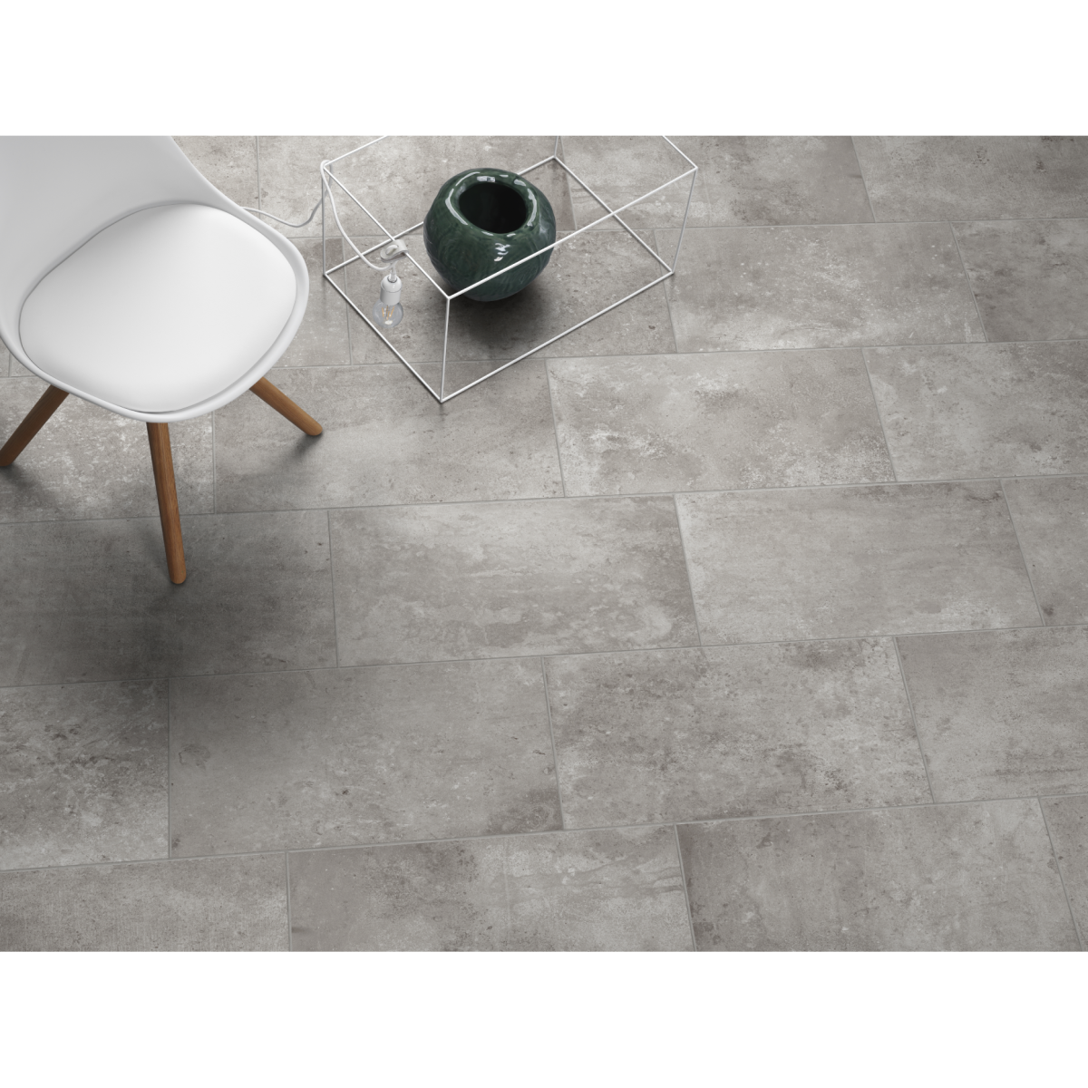 Modern megjelenésű, szürke színű, beltéri padlólap.
