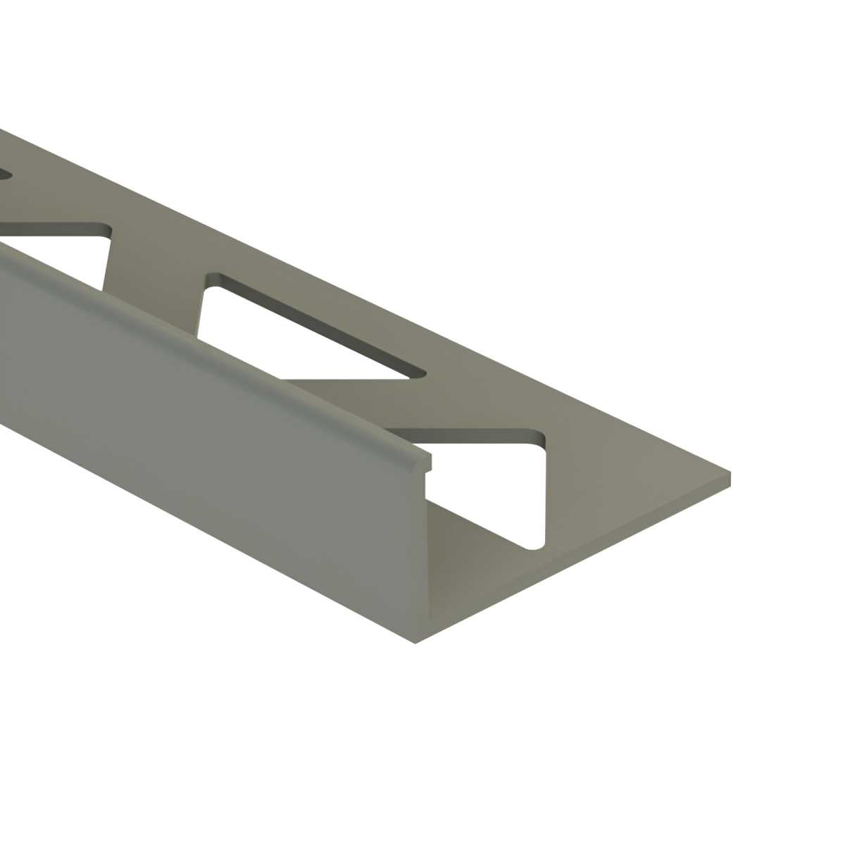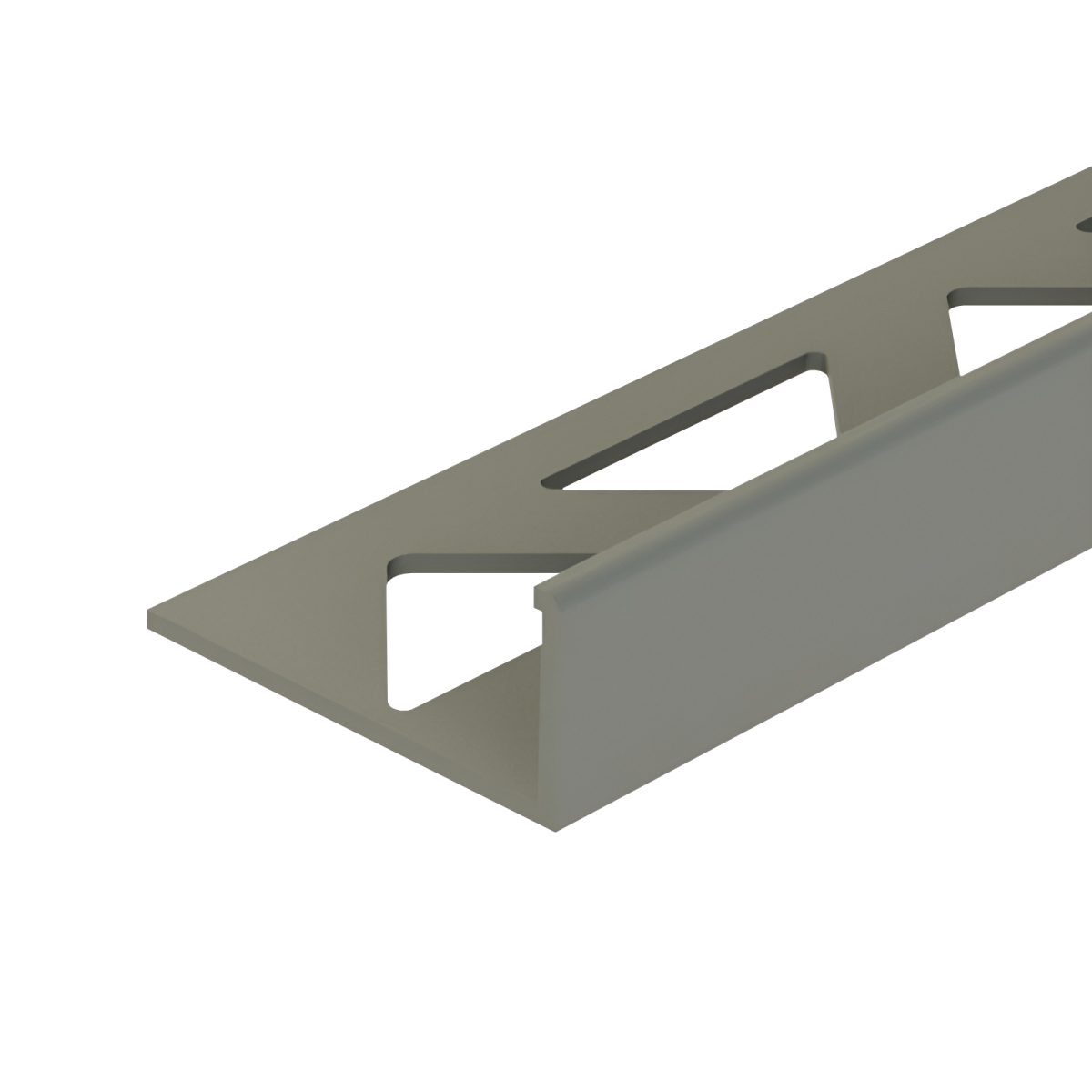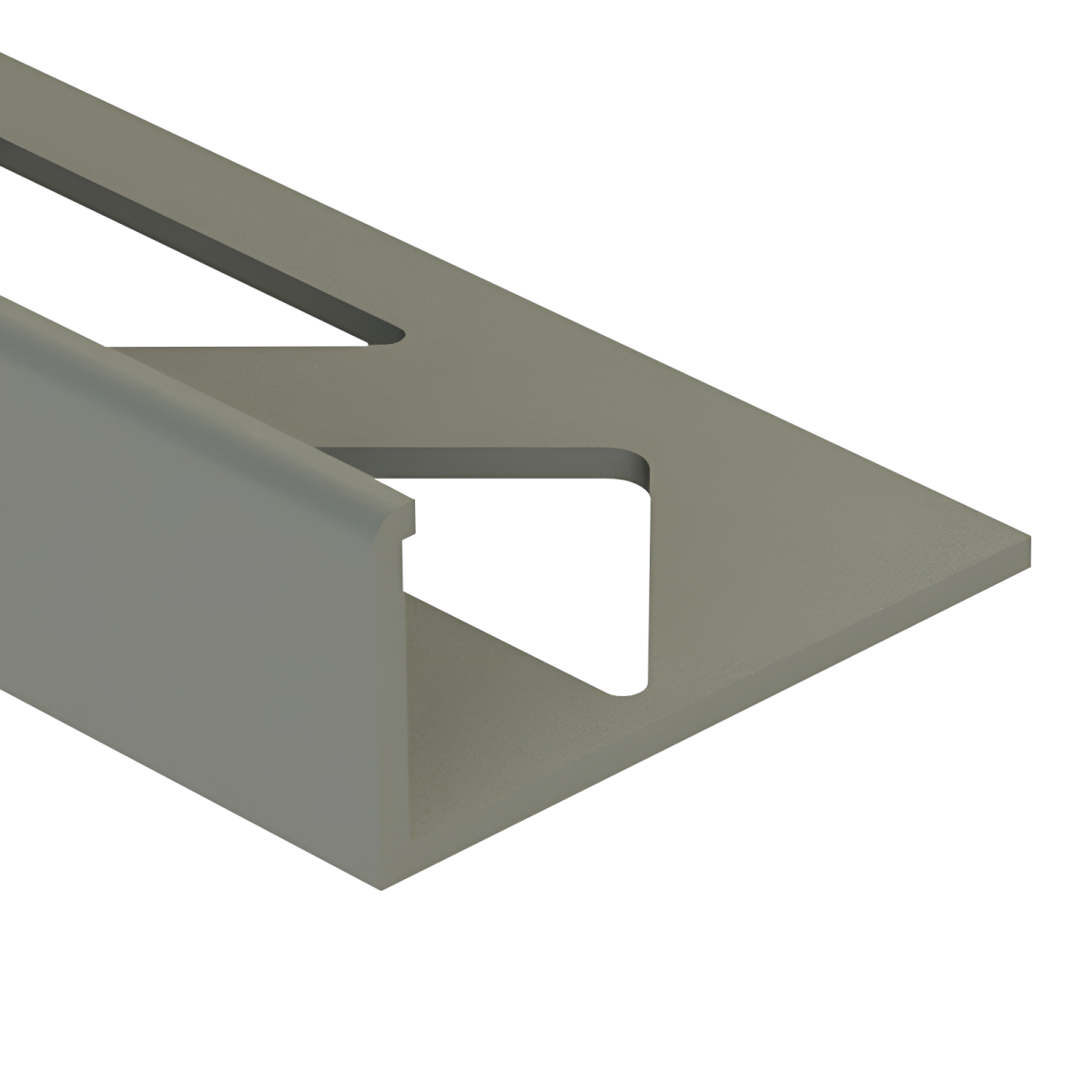 Ez a középszürke színű, szögletes kialakítású PVC csempeélvédő letisztult megoldást kínál a csempével burkolt felületek éleinek lezárására.