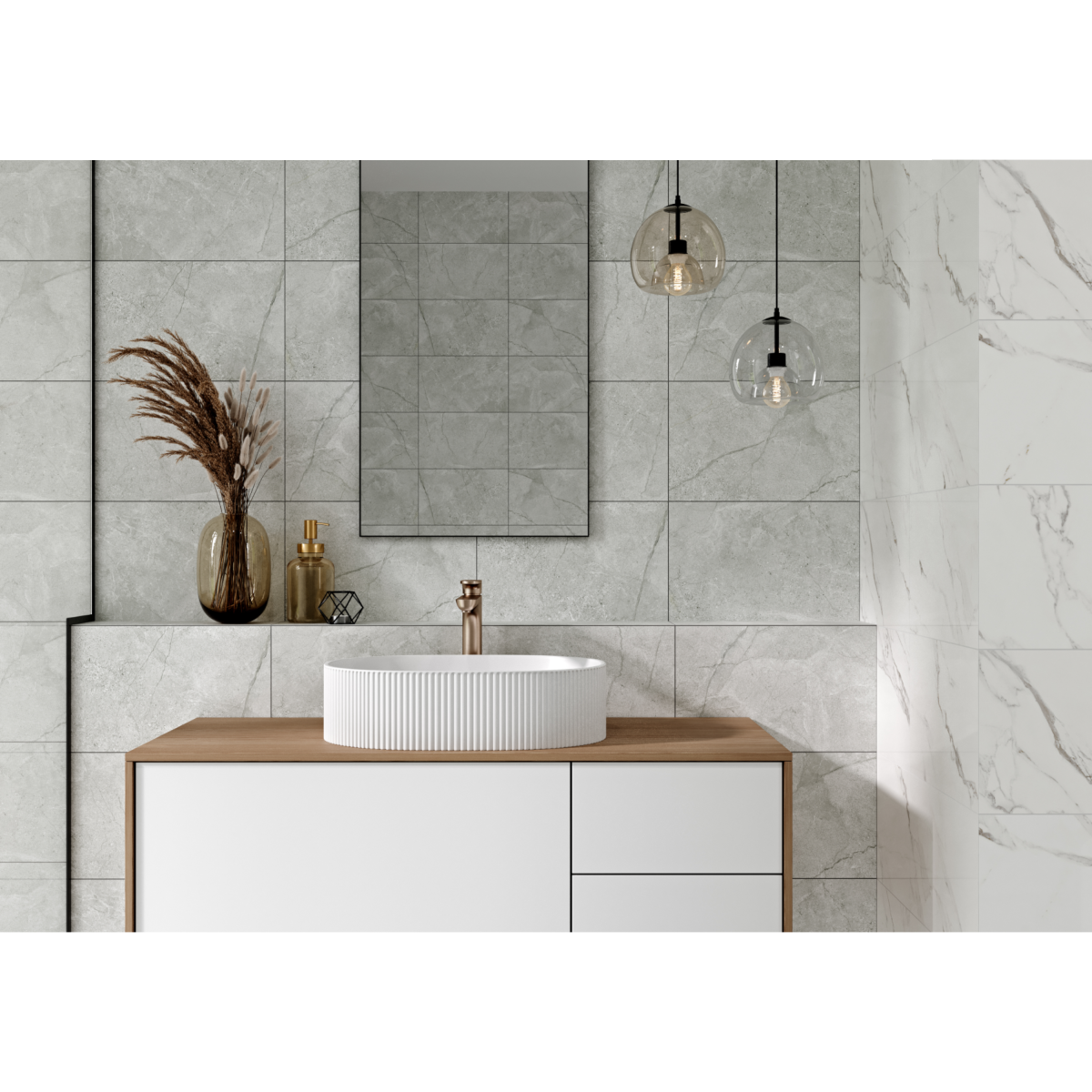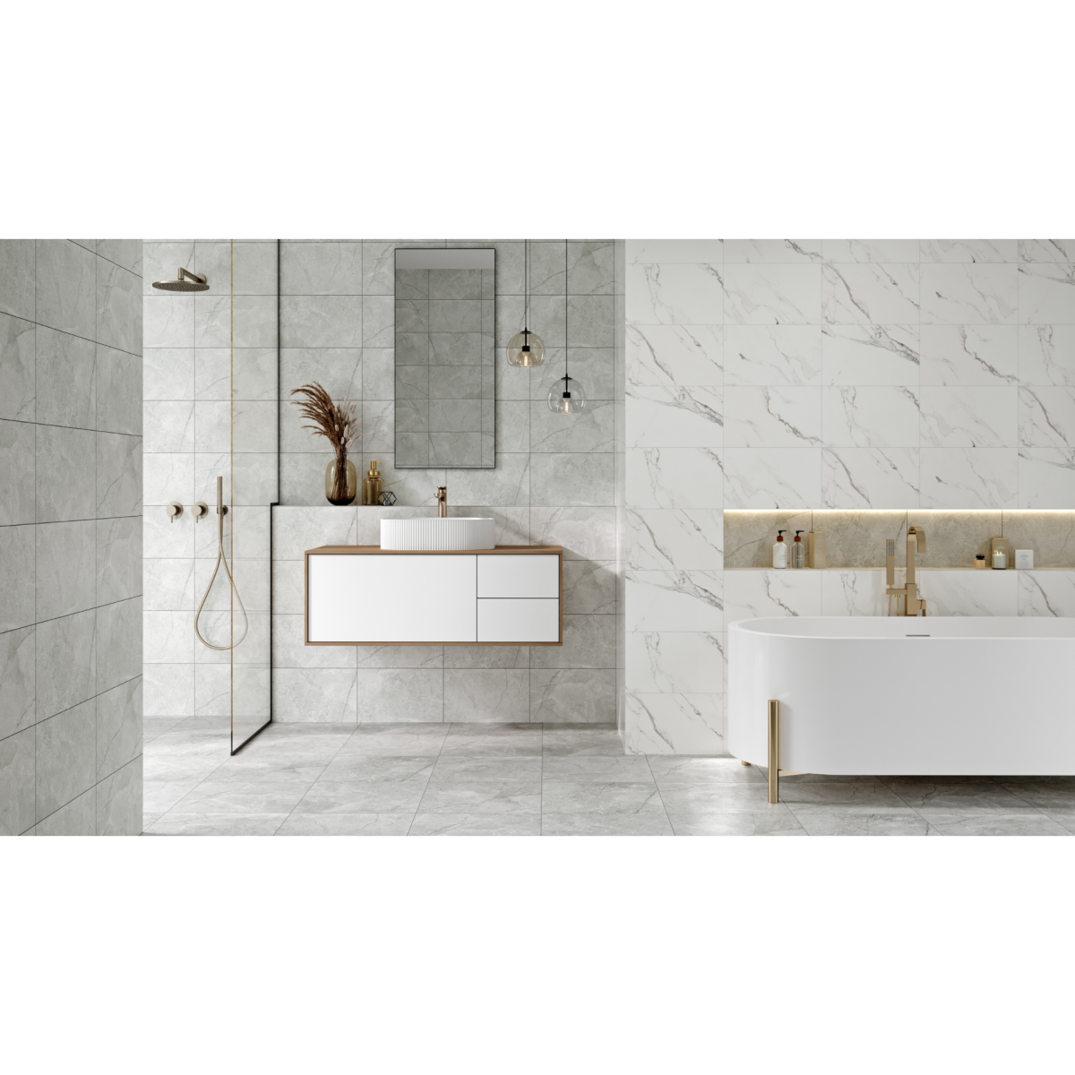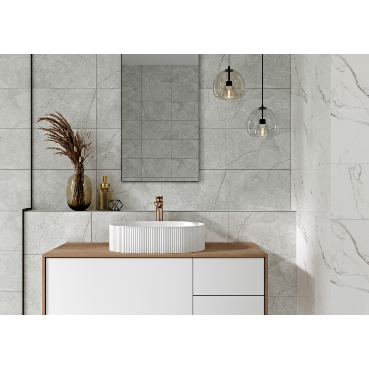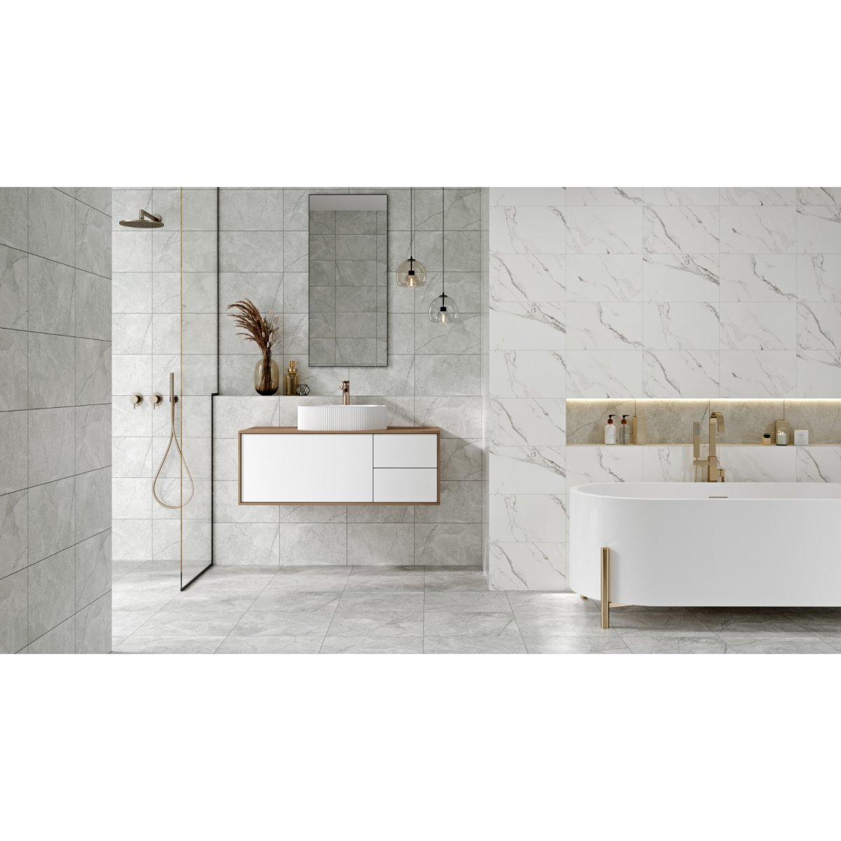 A Betty fali csempe világosszürke színe és kőmintás felülete letisztult, harmonikus megoldást kínál a modern belső terek falburkolásához.