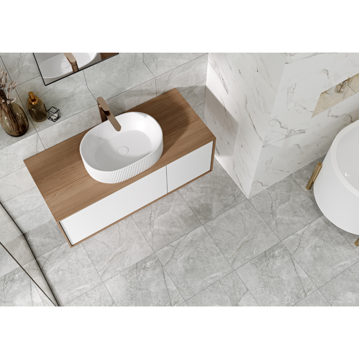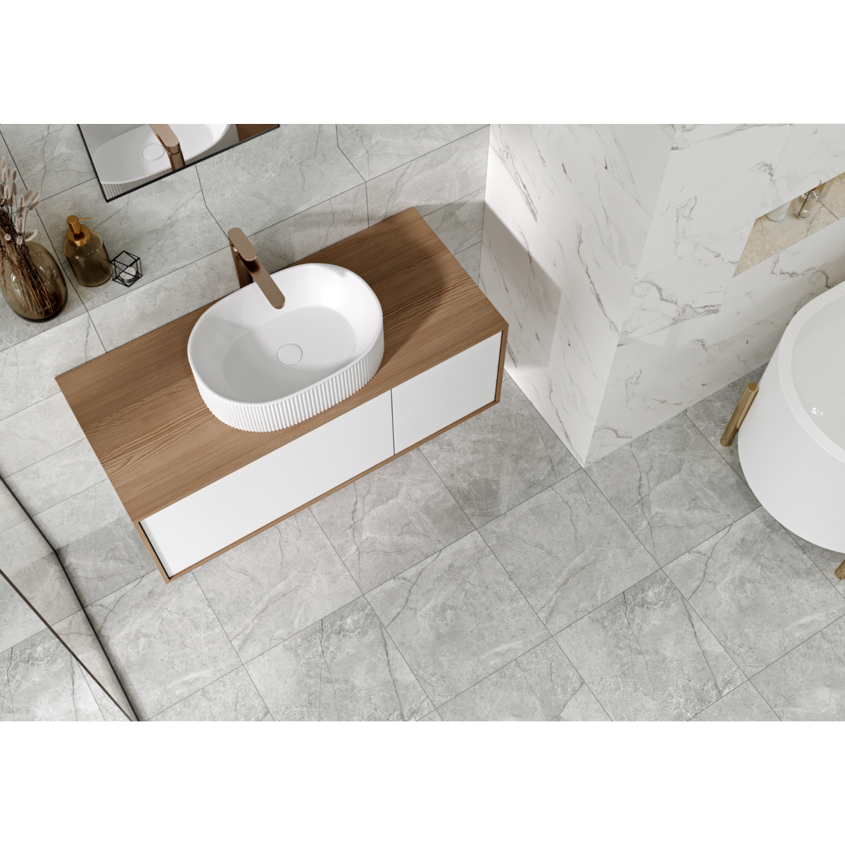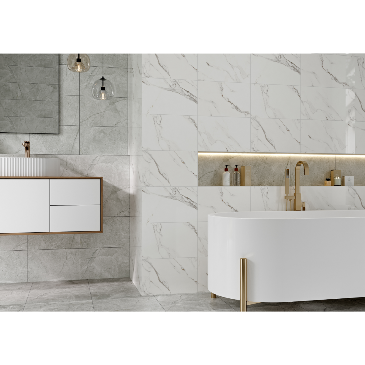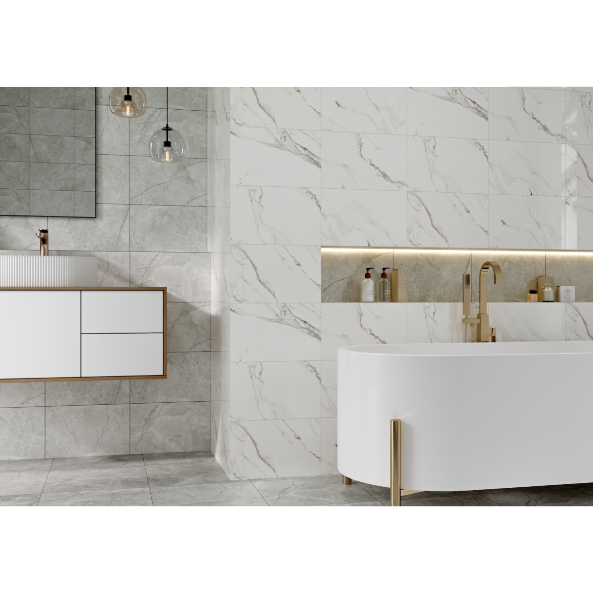 A Betty fali csempe világosszürke színe és kőmintás felülete letisztult, harmonikus megoldást kínál a modern belső terek falburkolásához.
