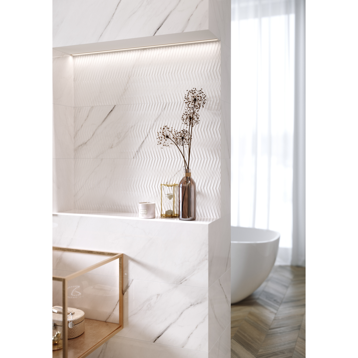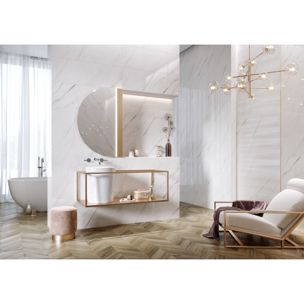 Carrara Chic struktúrált fali csempe, 29x89 cm méretben, 1,29m2/csomag kiszerelésben, fehér (fényes) színben.
