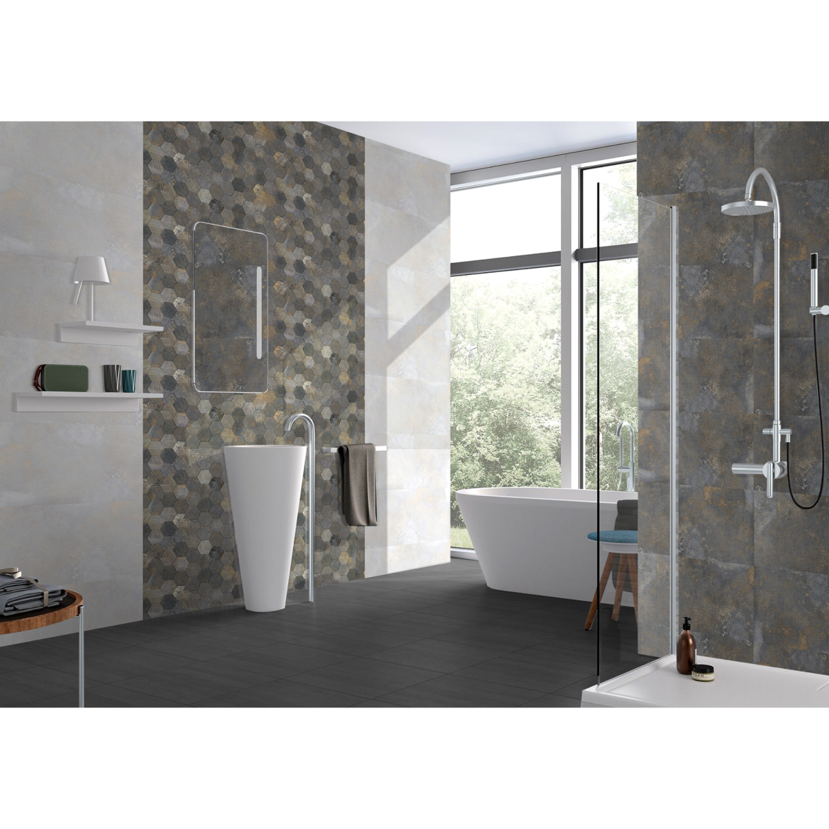 A Sidero fali csempe különleges kőhatású mintázatával és világosszürke színével elegáns, letisztult megjelenést biztosít a beltéri felületeken.