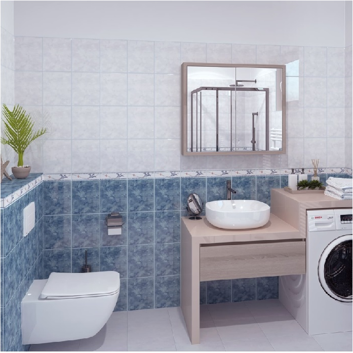Klasszikus márványhatású, világoskék színű, fényes felületű fali csempe, mely kitűnő választás a fürdőbe.