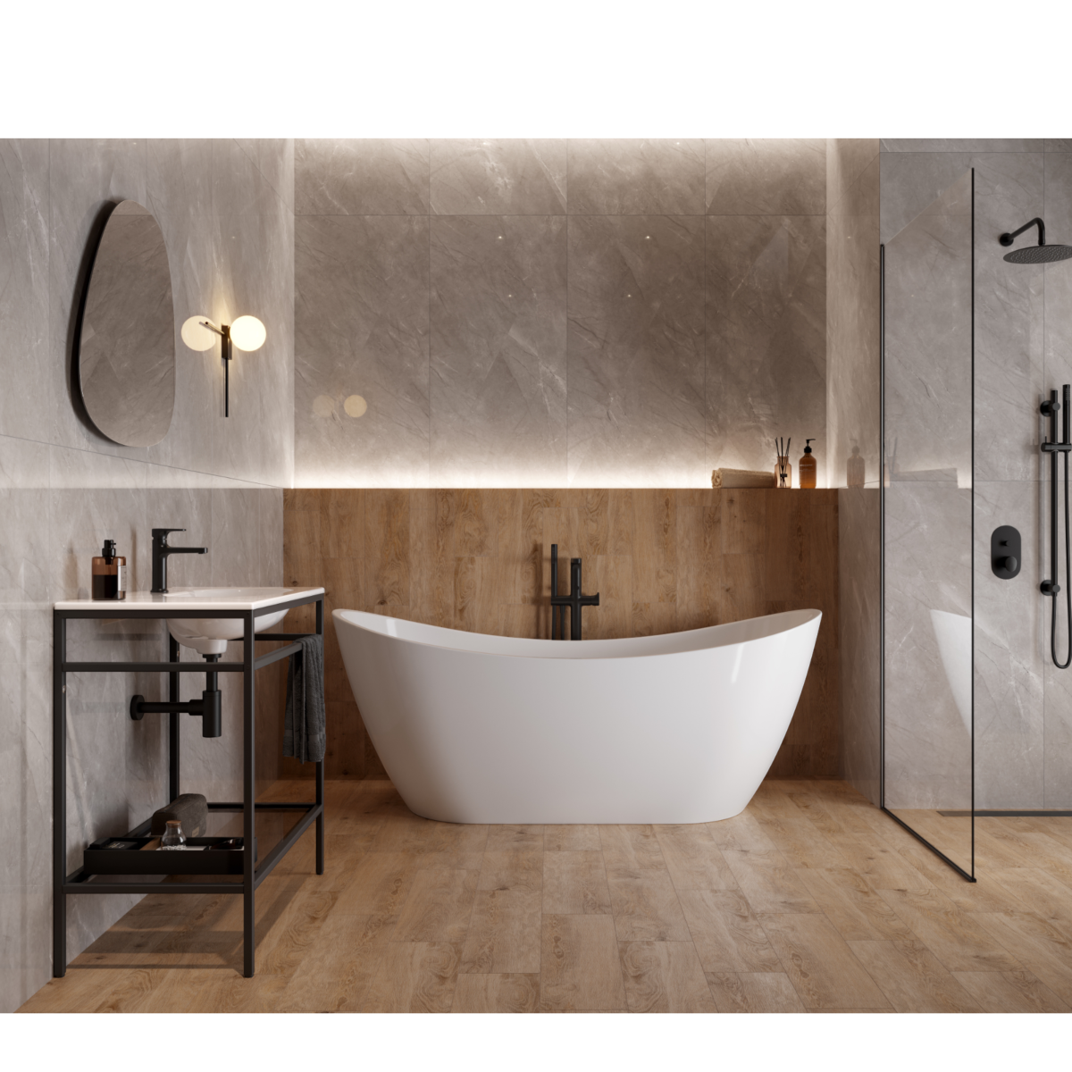 A nagyformátumú lap letisztult, modern összképet ad, miközben a fény szépen játszik a polírozott felületen. Visszafogott színe miatt könnyen kombinálható fával és fémmel is, így klasszikus és kortárs enteriőrben egyaránt működik. Beltérben falra és alacsony igénybevételű padlóra, kültéren pedig fali burkolatként ajánlott.
