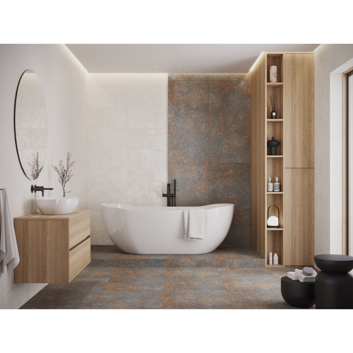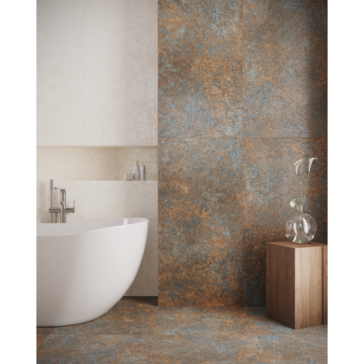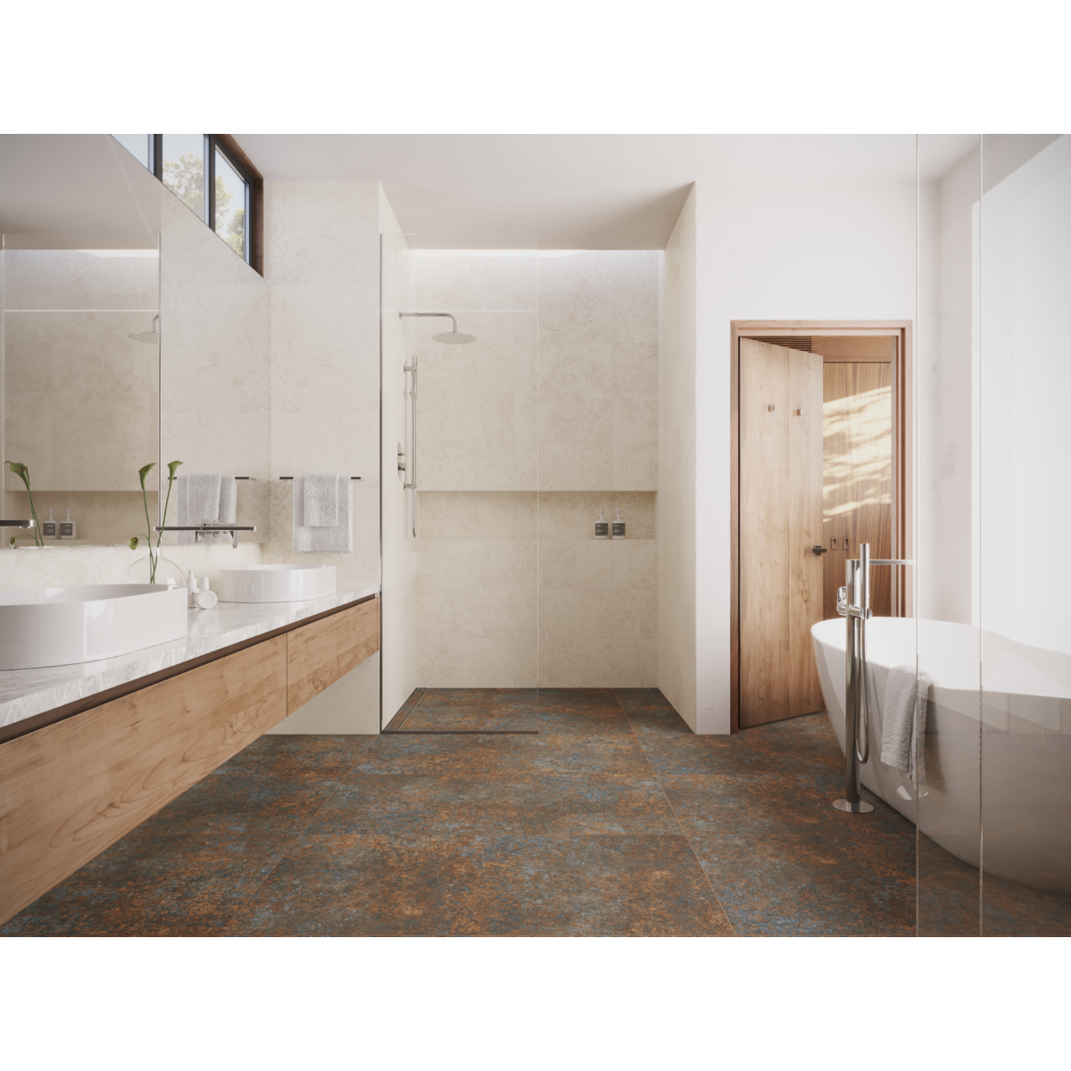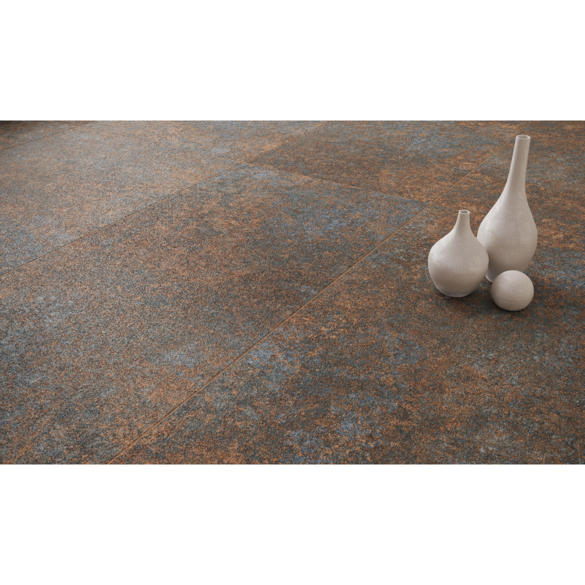 A Liv Elements család rezes árnyalatú, 59,8×59,8 cm-es gres padlólapja különleges felületi hatásával karakteres és egyedi megjelenést kölcsönöz bármilyen térnek. A rozsdás hatású mintázatot a matt graníliás felület teszi még erőteljesebbé, így kiválóan illeszkedik ipari, loft vagy modern stílusú enteriőrökhöz.