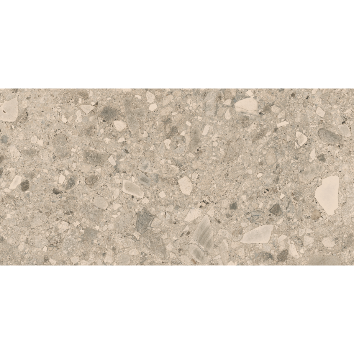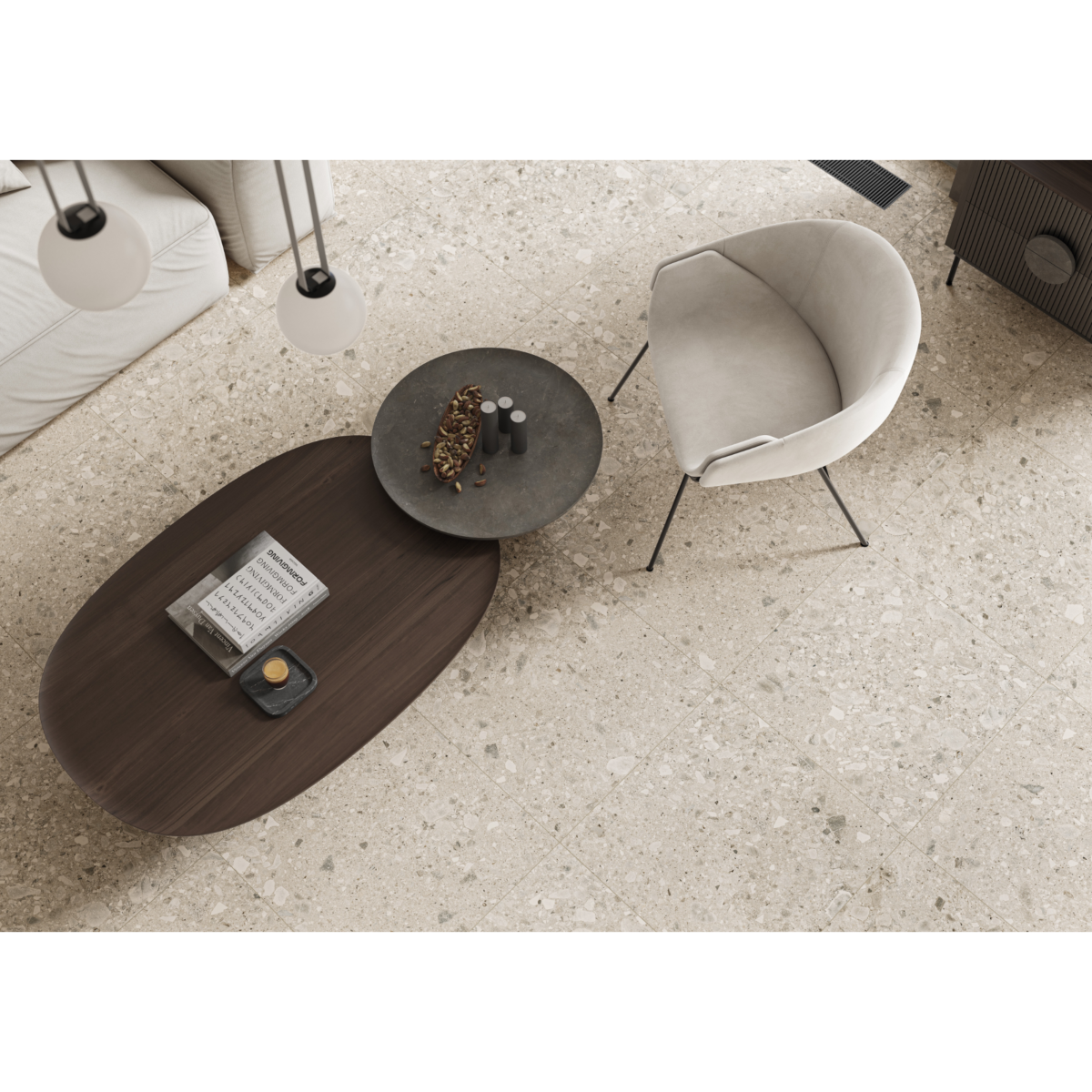 A Terrazzo Stone gres padlólap a természetes kövek eleganciáját idézi modern formában. A mokka árnyalatú, apró szemcsés „kő a kőben” mintázat gazdag részleteivel különleges textúrát ad a felületnek, amely egyszerre természetes és dekoratív hatású. Matt felülete visszafogott fényt ad a térnek, harmonikusan illeszkedve fához, betonhoz vagy más természetes anyagú burkolatokhoz.