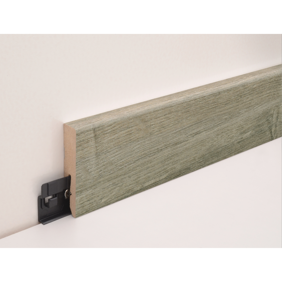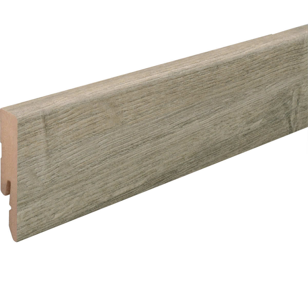 MDF58 AN530 szegélyléc laminált padlóhoz. Mérete: 2400x12x58 mm. A szegélyléc impregnált dekorfóliával van laminálva, amely Valencia tölgy mintázatú.