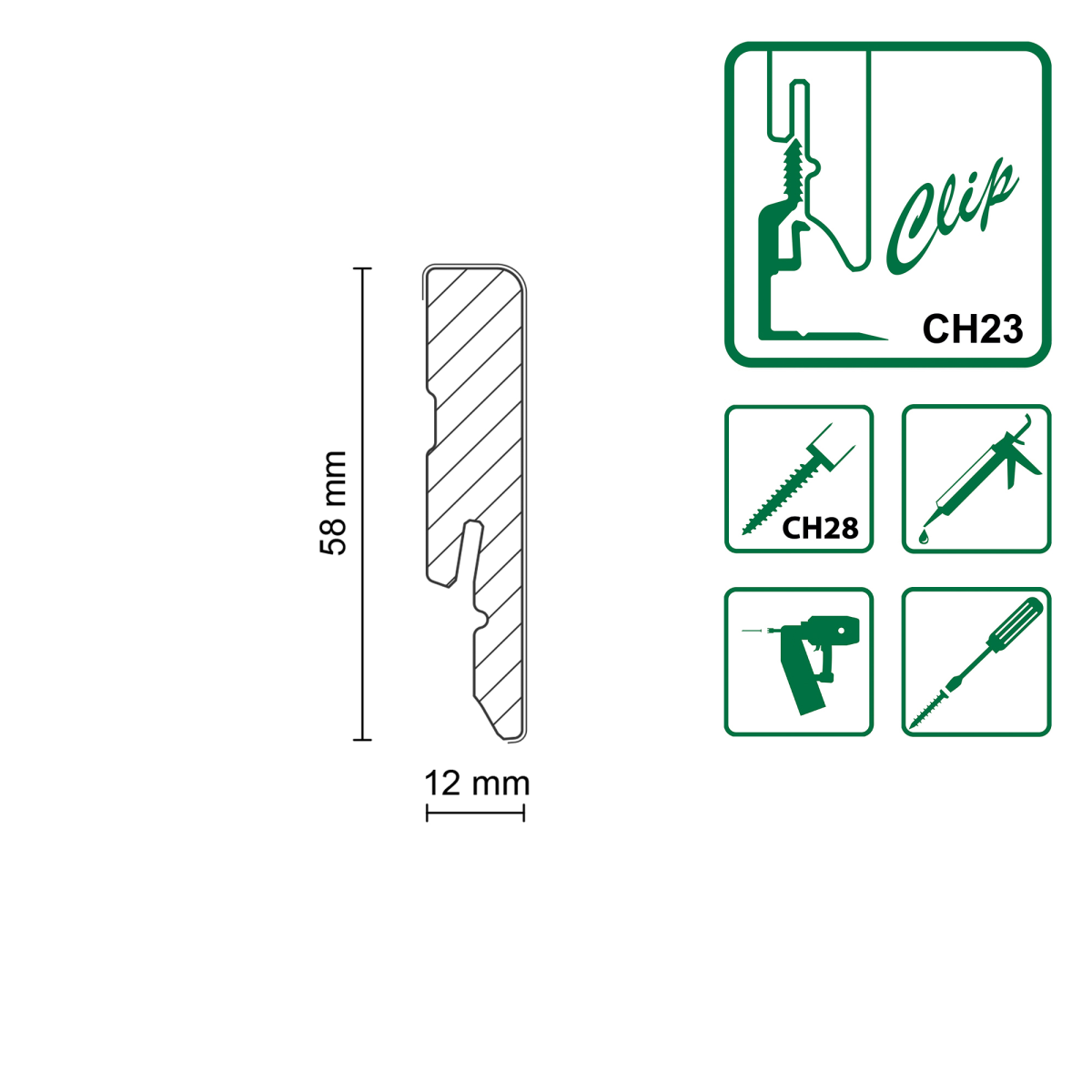 A szegélyléc ragasztható, vagy a megfelelő CH23 klipsz segítségével rögzíthető a falra, 1cm dilatációs hézag lefedésére alkalmas.