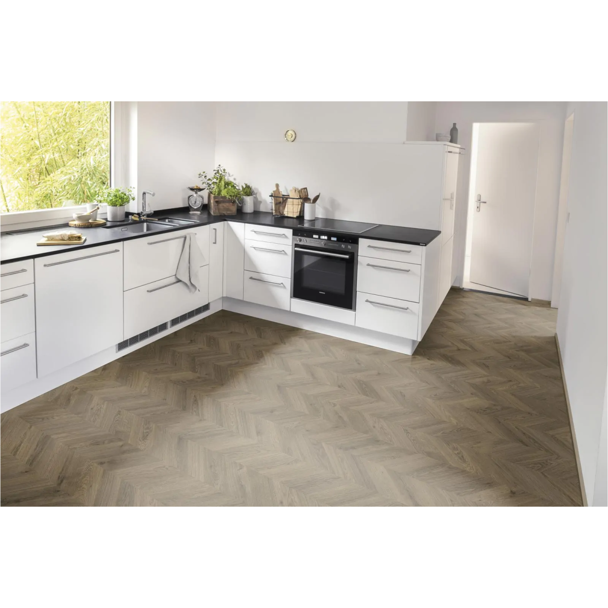 Barna Weinburg Tölgy home laminált padló 1292x327x8mm méretben, 2,53 m2/csomag kiszerelésben. Egyszerű tisztán tartani és 8 mm-es vastagságának köszönhetően tartós burkolóelem, mely a vendégek tetszését is biztosan elnyeri majd.