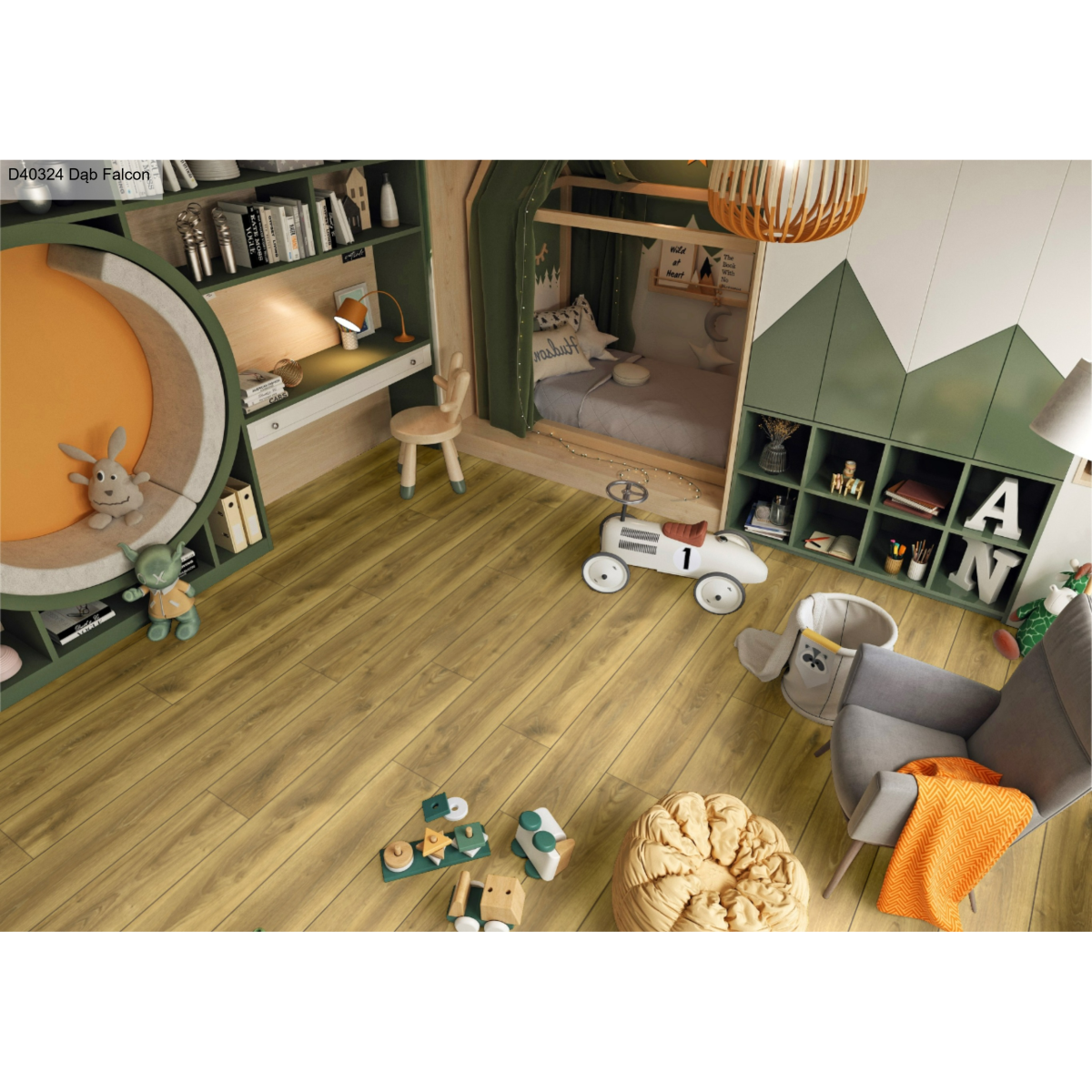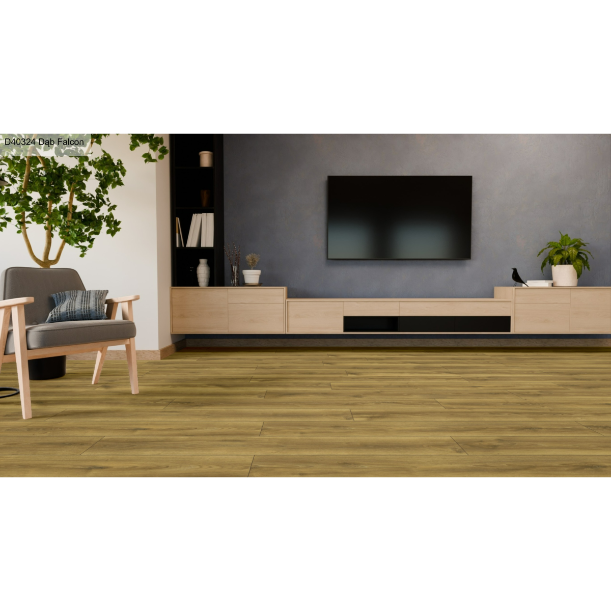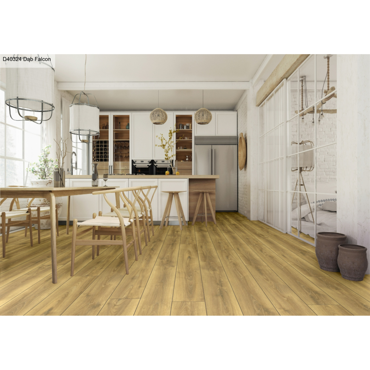 A Volo Aqua Falcon laminált padló modern tölgy árnyalata és 72 órás vízállósága révén megbízható és esztétikus megoldást kínál a háztartás legkülönbözőbb helyiségeibe. Ellenáll a véletlen vízkiömléseknek, és könnyen tisztán tartható. A hosszú, 1380 mm-es panelek letisztult és tágas burkolatképet biztosítanak, miközben az AC5/33 kopásállósági besorolás lehetővé teszi a fokozott igénybevételt is.