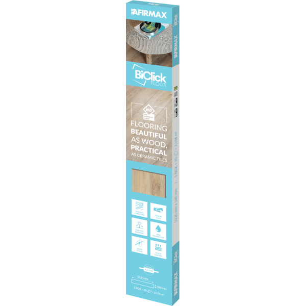 Afirmax BiClick klikkes SPC vinyl padlóburkolat, 100%-ban vízálló, 23/32 magas kopásállóságú, Vallinge 2G klikk zárakkal rendelkezik. A kiemelkedő mérettartóssága miatt akár 200m2 felület is leburkolható egyben, extra dilatáció nélkül, gyönyörű mint a fa parketta, praktikus, mint a járólap; 2,196 m² / csomag kiszerelésben értékesítjük. Úsztatott rendszerben történő burkolás esetén minimum 200kPa (javasolt érték: 400kPa) nyomószilárdságú padlóalátét szükséges.