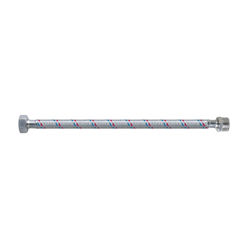 Rozsdamentes szövésű flexibilis bekötőcső, 1/2"-os, 80 cm-es méretben. Külső és belső menetes csatlakozóval. Épületgépészeti berendezések, mosdók, csapok, WC-k, bidék, vízmelegítők és egészségügyi berendezések bekötéséhez. A bekötőcsövek az ivó- és technológiai vízellátás területén 10 bar nyomásig és 60°C-ig használhatók. Védőszövet: AISI 304-es rozsdamentes acélból, 95%-os fedési sűrűségű. Csatlakozók: nikkelezett sárgarézből, gumitömítéssel.