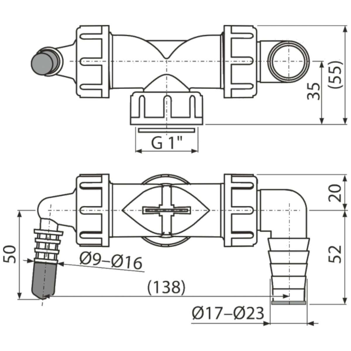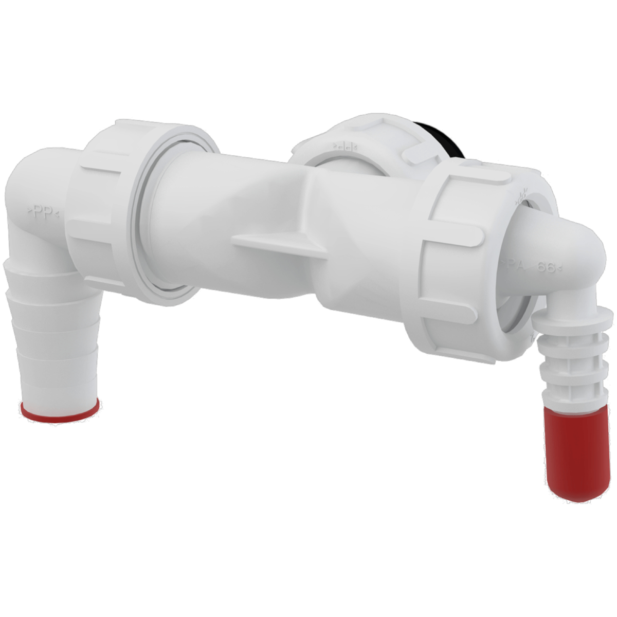 A két csőcsonk 8-23 mm átmérőjű tömlők fogadására alkalmas, a beépített csappantyúk pedig megakadályozzák a visszaáramlást.