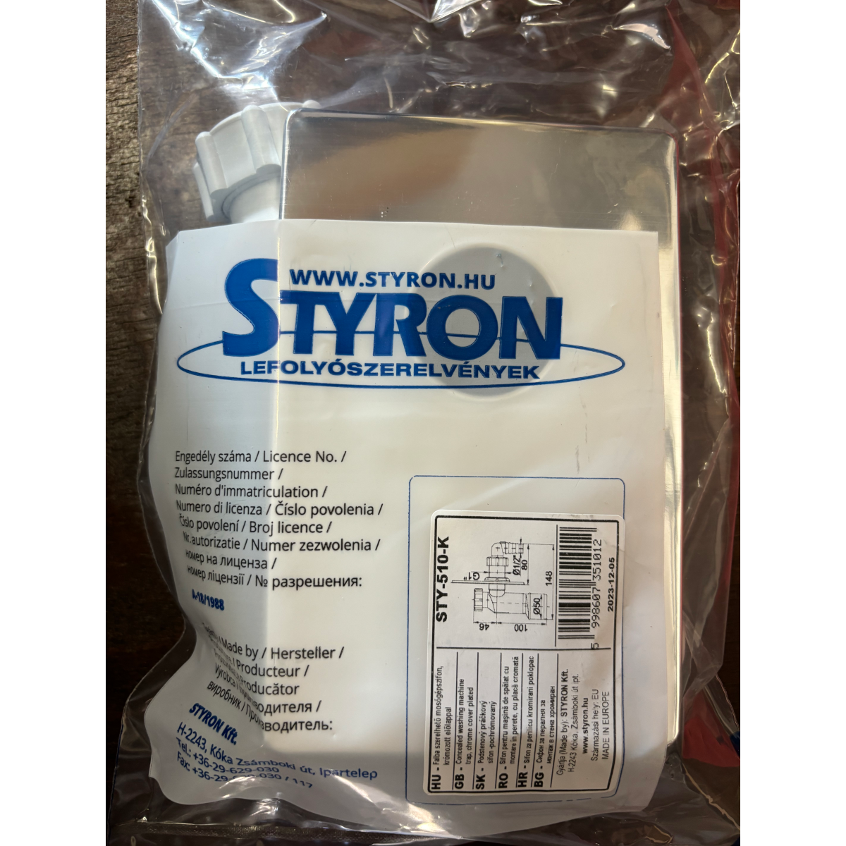 Styron falba szerelhető mosógép szifon, becsatlakozás:1/2", elfolyás:50 mm, krómozott előlap, mosógép-csatlakozó. A kép tájékoztató jellegű.