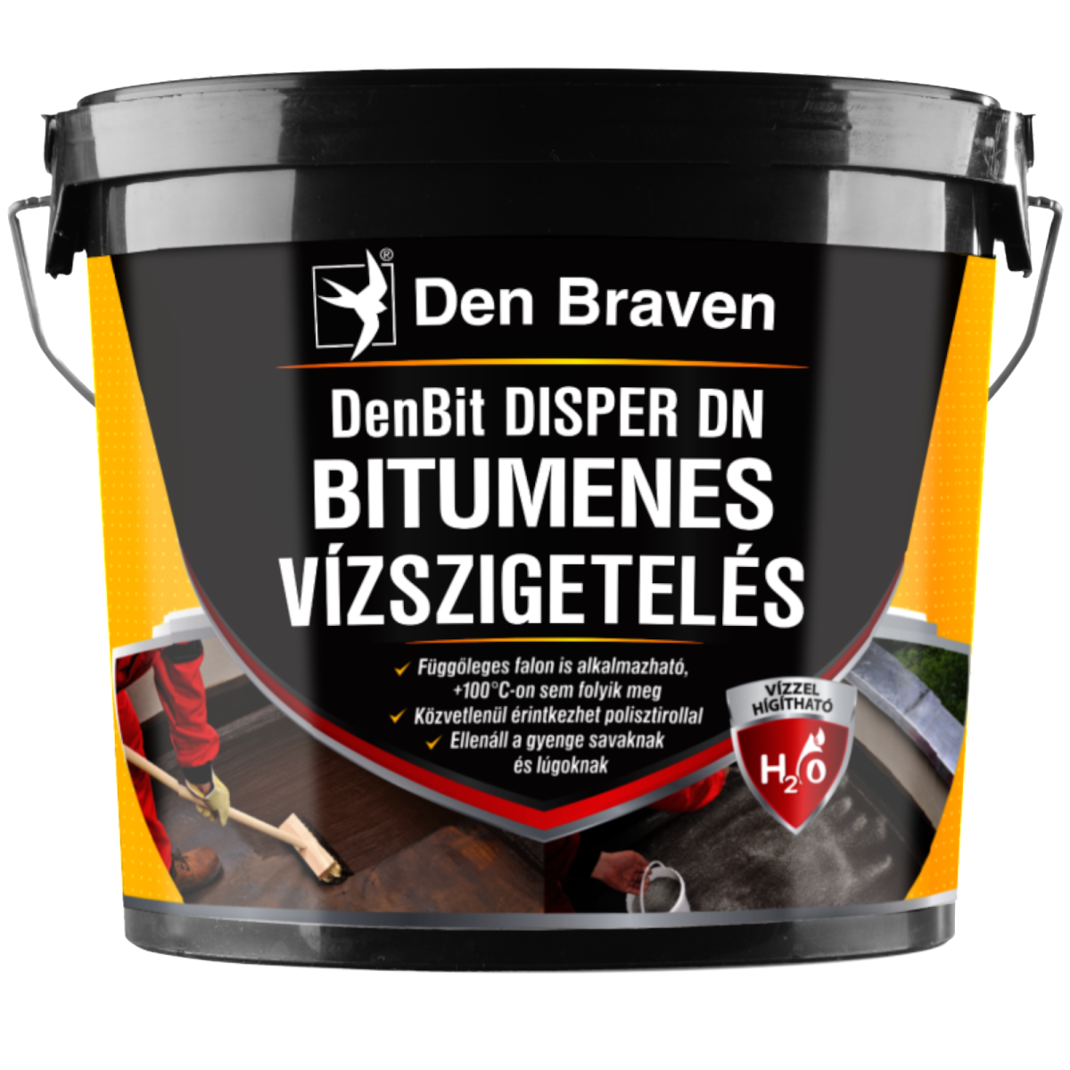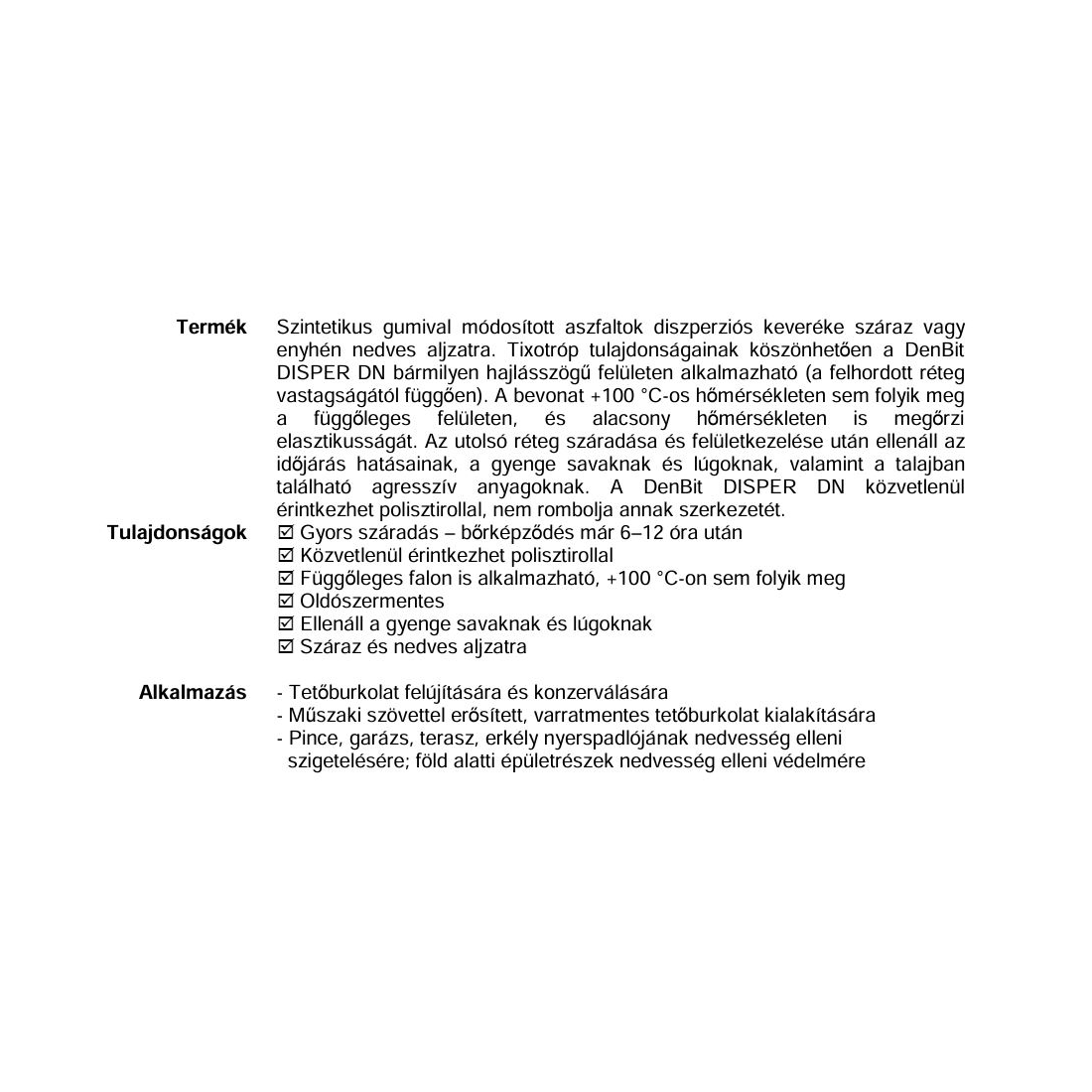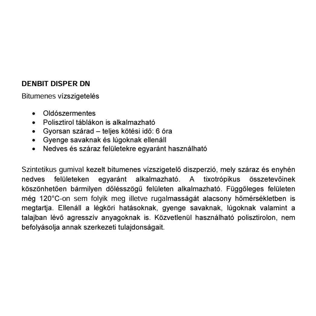Szintetikus gumival módosított bitumenes anyagok diszperziós keveréke száraz vagy enyhén nedves felületre. Tixotrópikus tulajdonságainak köszönhetően a DenBit DISPER DN bármilyen dőlésszögű felületen alkalmazható. Aljzat típusa: beton, cement vagy cement-mész vakolat, eternit, bitumenes lemezek és hasonló bitumenalapú anyagok, valamint DenBit DISPER AS alapozóval kezelt felületek. Alkalmazás: tetőburkolatok felújítására és védelmére; műszaki szövettel erősített, korc nélküli tetőburkolat felrakására; pince, garázs, terasz, erkély nyerspadlójának párazáró szigetelésére; föld alatti épületrészek nedvesség elleni védelmére. Anyagszükséglet: 0,6 – 1,0 kg/m2 egy rétegben. Ellenáll a gyenge savaknak és lúgoknak, oldószermentes, közvetlenül érintkezhet polisztirollal, gyors száradás, 6 óra alatt teljesen kikeményedik.