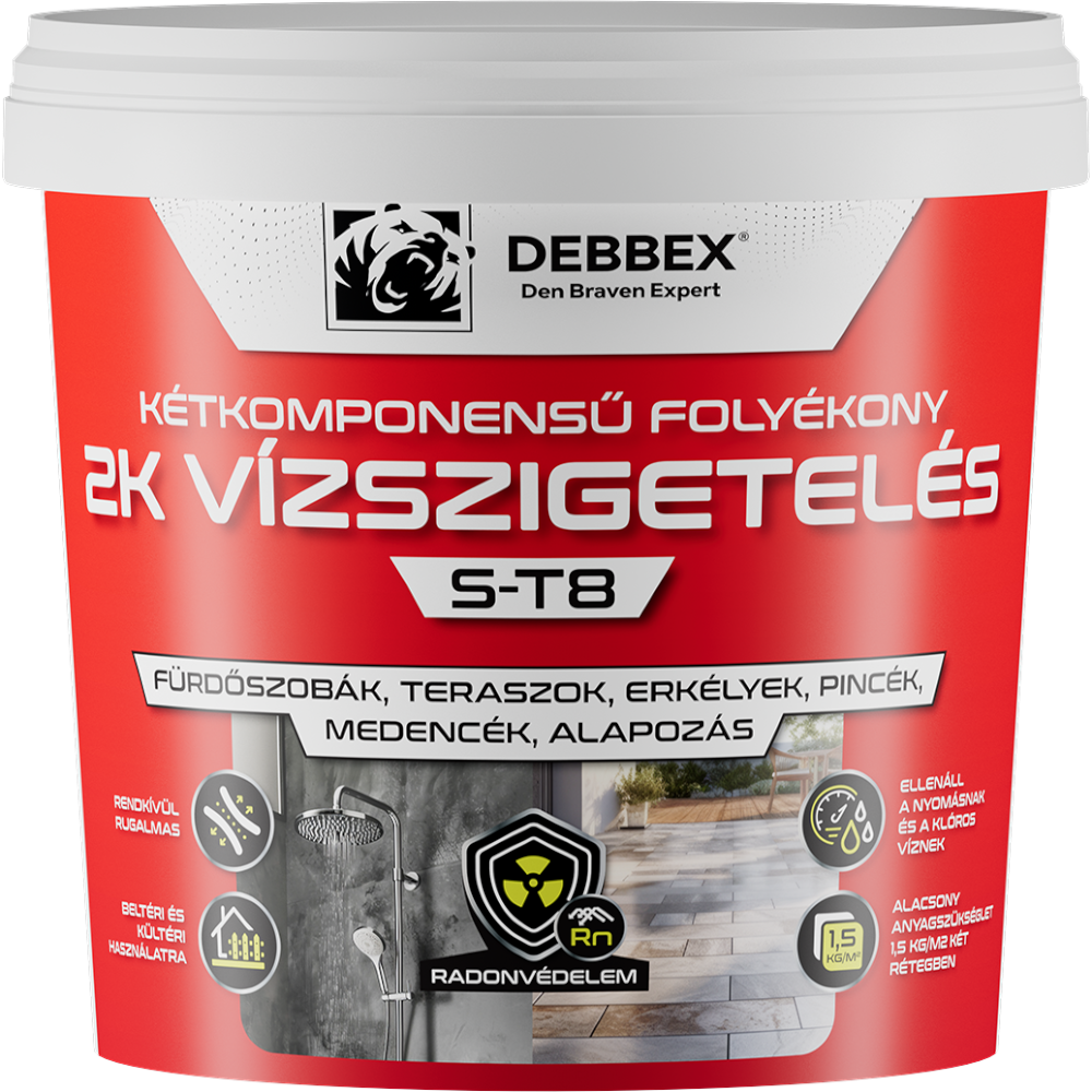 Az S-T8 kenhető vízszigetelés egy cement alapú, kopolimer diszperziós, kétkomponensű anyag, amely kikeményedés után vízzáró és rugalmas membránt alkot. Függőleges és vízszintes felületeken egyaránt jól tapad, így sokoldalúan alkalmazható magas- és mélyépítési munkálatok során. Az elkészült bevonat tartósan rugalmas, időjárás- és fagyálló tulajdonságainak köszönhetően hosszú távon is megbízható védelmet biztosít.