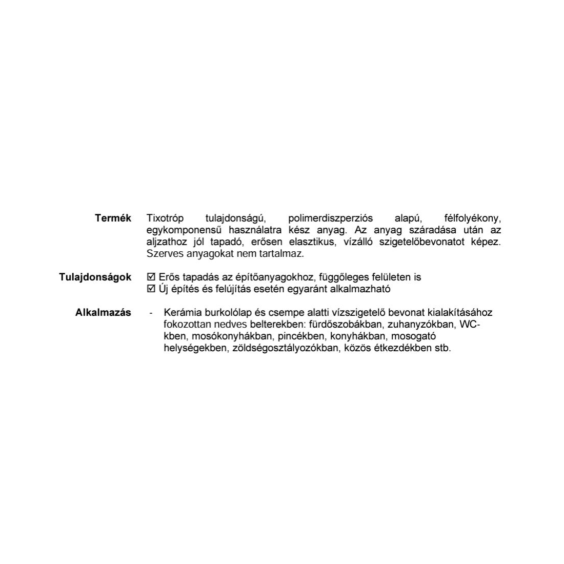 Zwaluw egykomponensű fürdőszobai vízszigetelés. 5 kg, fehér, beltéri felhasználásra. Víznyomásnak és állandó vízhatásnak nem kitett beltéri felületek hidegburkolást megelőző, burkolat alatti vízszigetelésére. Oldószermentes, azonnali felhasználásra alkalmas.