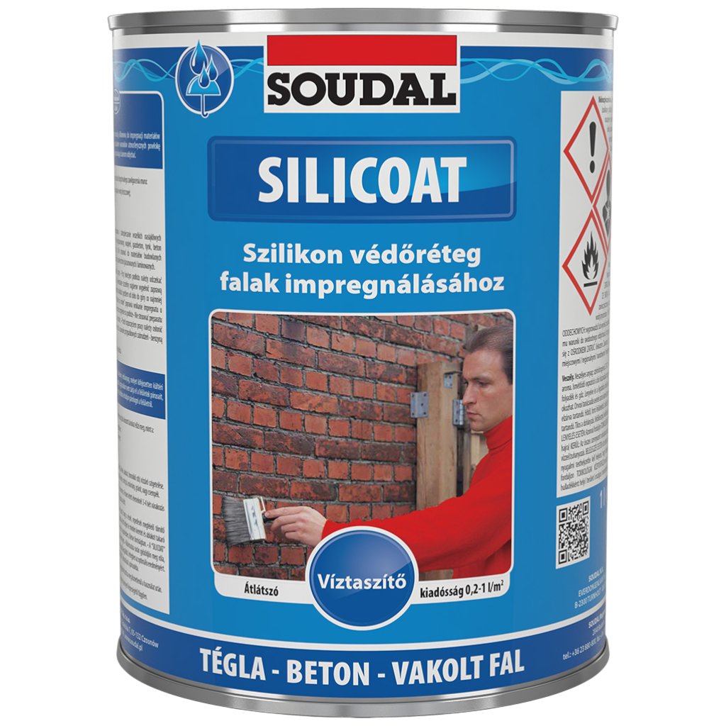 A Soudal Silicoat víztaszító impregnálószer 1 literes kiszerelésben hatékony megoldás falazatok felületkezelésére. A speciális összetételű anyag szilikon alapú védőréteget képez a felületen, amely víztaszító hatást biztosít.